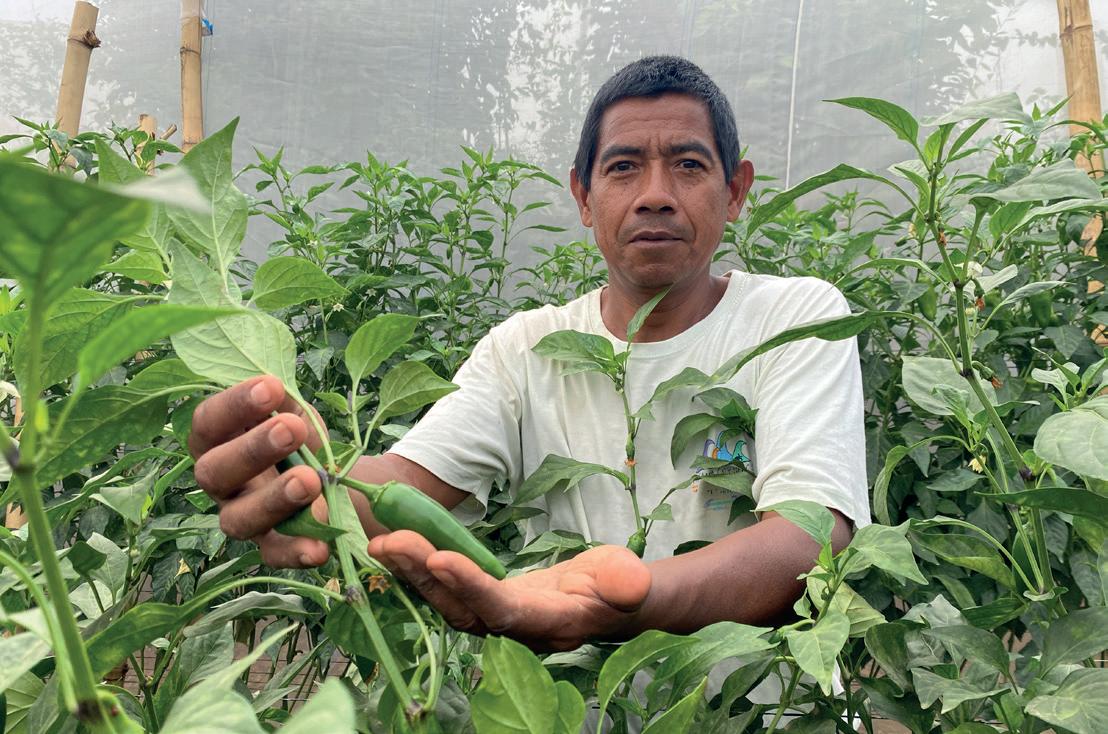 Ahora, con el apoyo y asistencia técnica de Ermin Morataya, de la agencia de Nueva Guadalupe, cultiva tomate Pony y P52 y chiles jalapeño y dulce, bajo condiciones protegidas en casas mallas; además, cultiva rábano a cielo abierto e incursiona en la reproducción de tilapias. Actualmente poseen dos casas malla con dimensiones de 400 metros cuadrados, donde cultivan el tomate, y la otra de 165 metros cuadrados para el cultivo de los chiles jalapeño (600 plantas) y dulce (100 plantas). Asimismo, mantienen una producción de 50 mil plantines de café en 1500 metros cuadrados. Y a cielo abierto producen rábano y en el reservorio están cultivando alrededor de 500 tilapias.