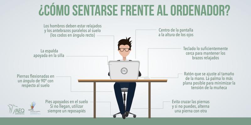 Una silla ergonómica, de base estable, con ruedas, regulable en altura y giratoria. Con respaldo también regulable en altura y profundidad (a ser posible, con refuerzo lumbar). Una mesa de trabajo lo suficientemente ancha que permita la colocación del ordenador y teclado de forma adecuada (de frente) y una organización adecuada del área de trabajo (orden). Recomendable reposabrazos y reposapiés