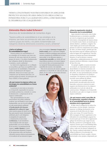 Directora de Sostenibilidad de Cementos Argos “Nuestra política de sostenibilidad es el eje estratégico de la empresa, que tiene una promesa de valor para cada uno de nuestros grupos de interés, y los pilares fundamentales que trabajamos desde las dimensiones económica, social y ambiental”. ¿Cuál es el enfoque de sostenibilidad de Argos? Nuestra política de sostenibilidad es el eje estratégico de la empresa, que tiene una promesa de valor para cada uno de nuestros grupos de interés, y los pilares fundamentales que trabajamos desde las dimensiones económica, social y ambiental. La visión de la organización se ve reflejada en esa política, que busca un equilibrio entre la generación de rentabilidad, el desarrollo social y la disminución del impacto ambiental, dentro de un marco que está compuesto por las buenas relaciones con nuestros grupos de interés, los principios del Pacto Global y el buen gobierno. ¿De qué manera la empresa enfoca sus estrategias de sostenibilidad en el tema ambiental? La promesa en este tema se encuentra en el desarrollo responsable de nuestras actividades productivas, teniendo en cuenta la disminución o compensación de los impactos ambientales. Hace aproximadamente dos años estructuramos una política ambiental moderna, que está basada en cinco pilares fundamentales, que son el eje de trabajo en toda nuestra gestión ambiental: el fortalecimiento del elemento ambiental de la cultura de Argos: todos nuestros grupos de interés son la base para mejorar nuestro desempeño ambiental, para lo cual trabajamos en programas de capacitación y comunicación en estos temas; ecoeficiencia, el cual entendemos como la relación entre una mayor productividad, con un uso eficiente de los recursos y la minimización del impacto; cambio climático, a través del cual buscamos disminuir el impacto de las operaciones sobre este fenómeno, enfocando nuestros esfuerzos principalmente en la medición de las emisiones de gases
