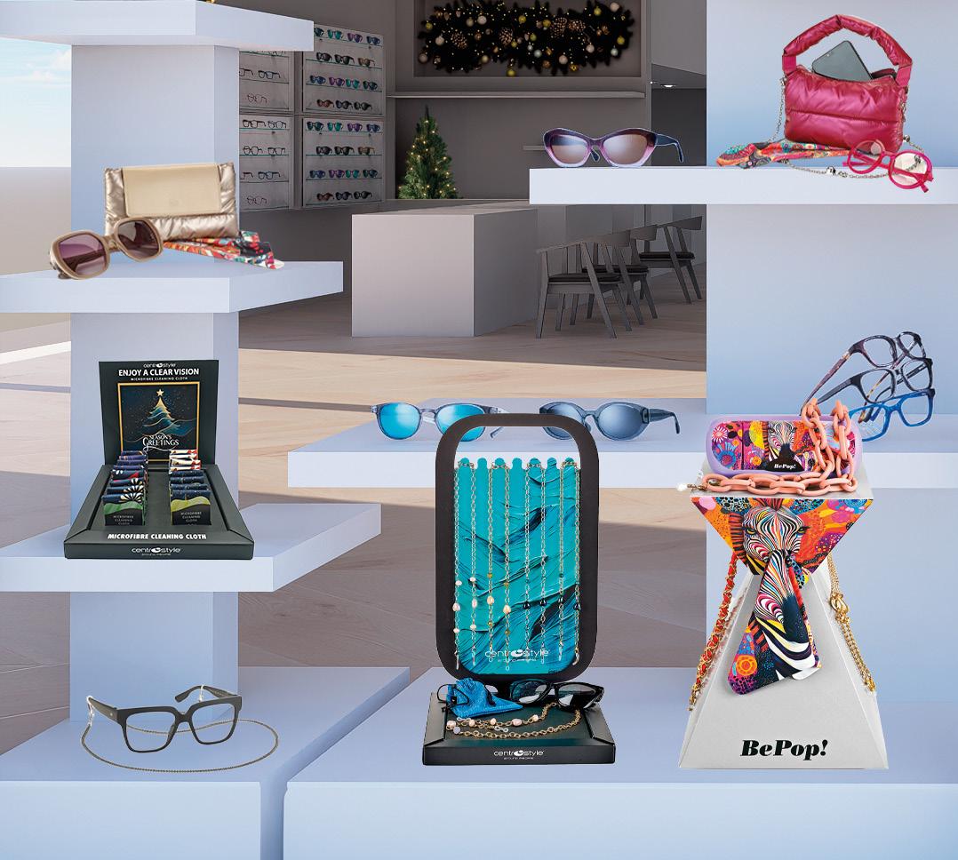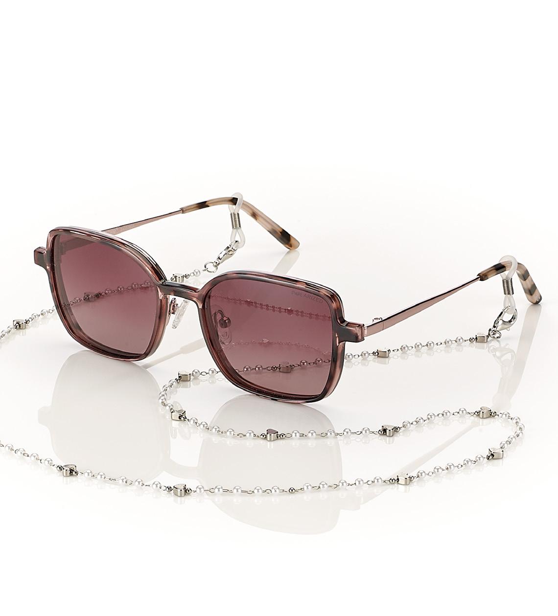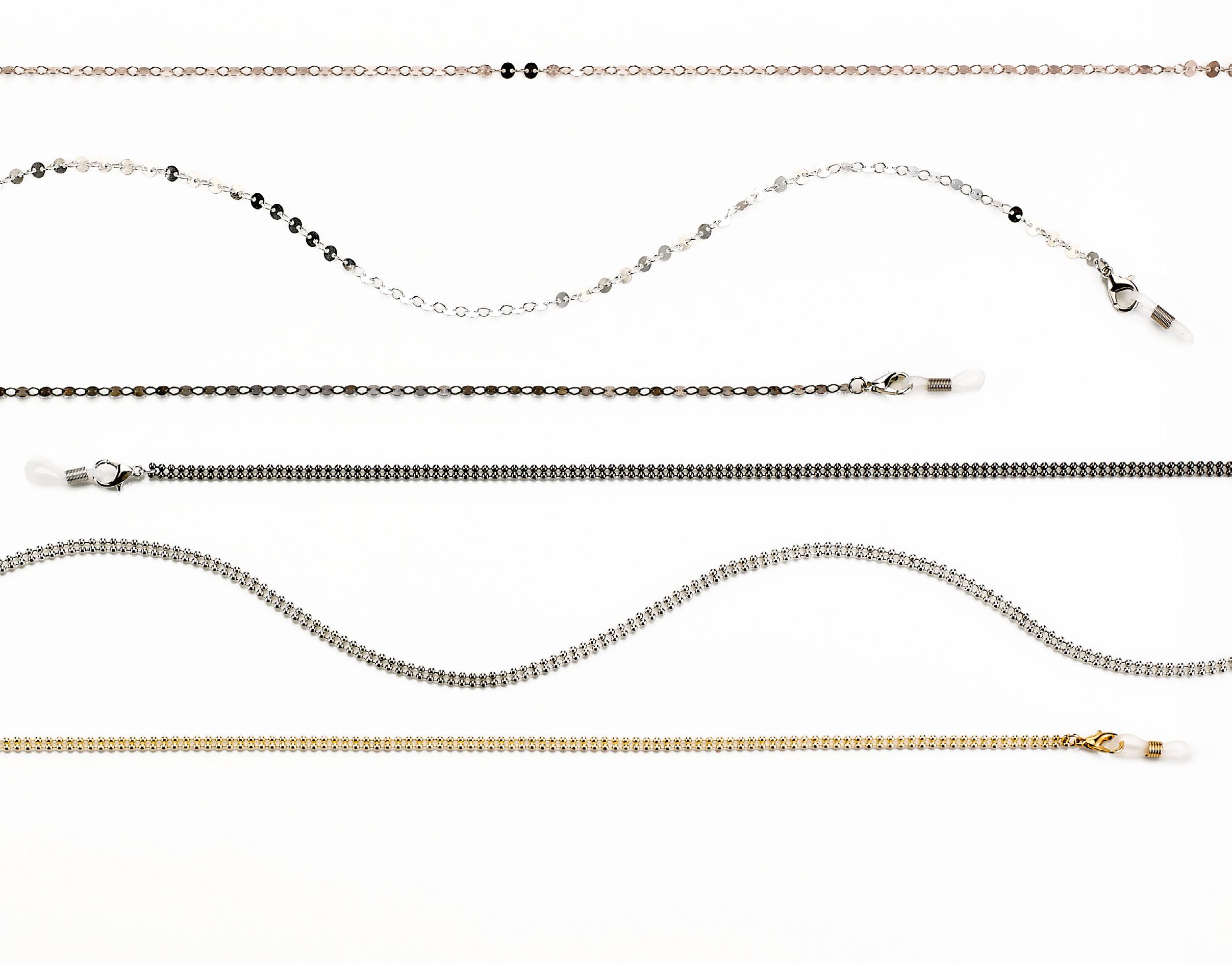 6 metal chains in two models and three colour variations. One model has a shiny effect and is feminine, while the other is unisex. Both are ideal for sunglasses and eyeglasses. Supplied with a practical display tray and a microfibre pouch.