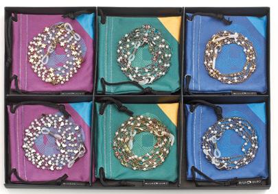 6 chains with decorative acetate elements. Supplied with a microfibre pouch.