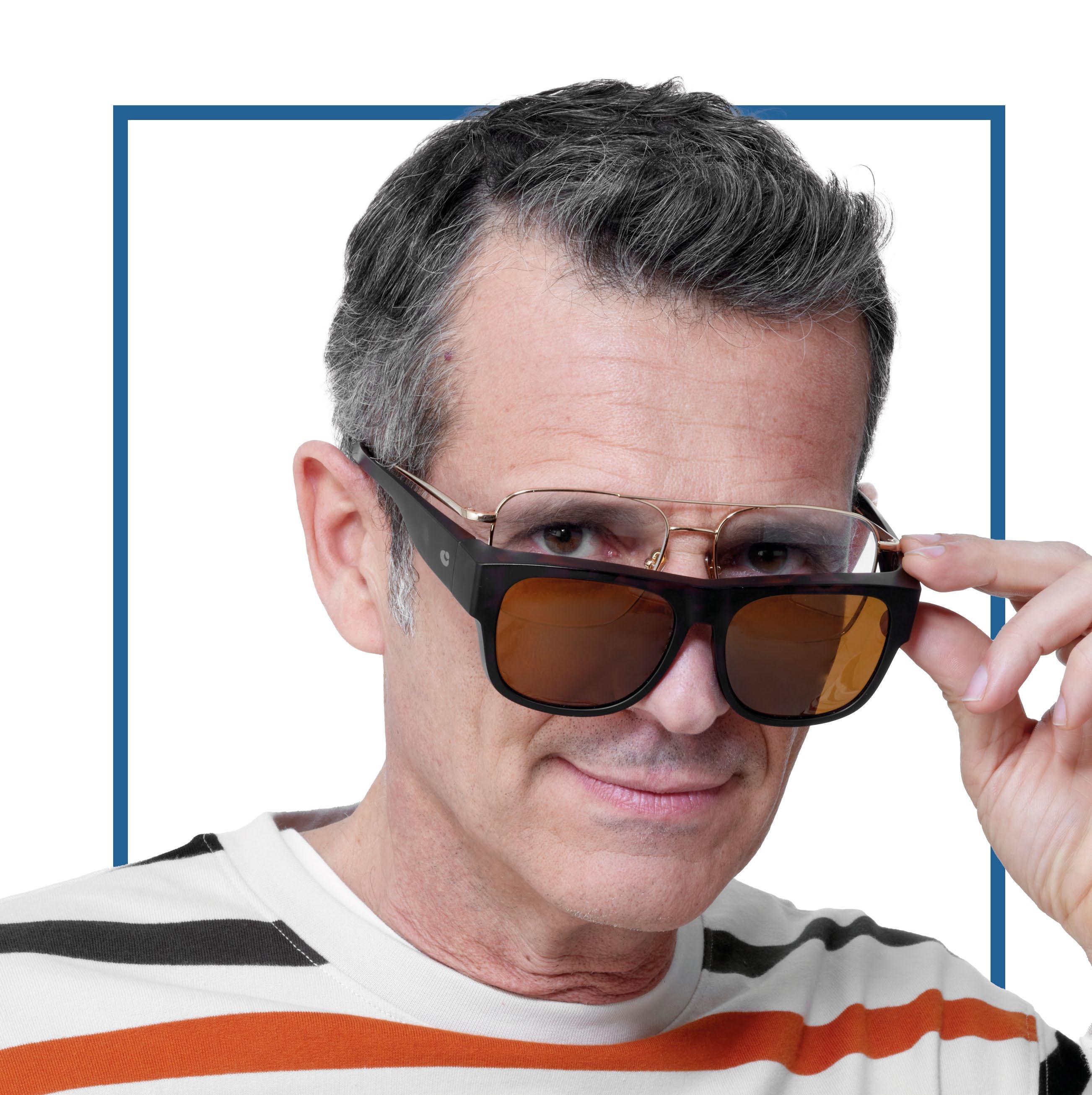 I sovraocchiali proteggono gli occhi dai raggi solari. Leggeri e confortevoli, non “pesano” sopra la montatura da vista. La forma avvolgente e le lenti polarizzanti di qualità riducono l’affaticamento oculare.