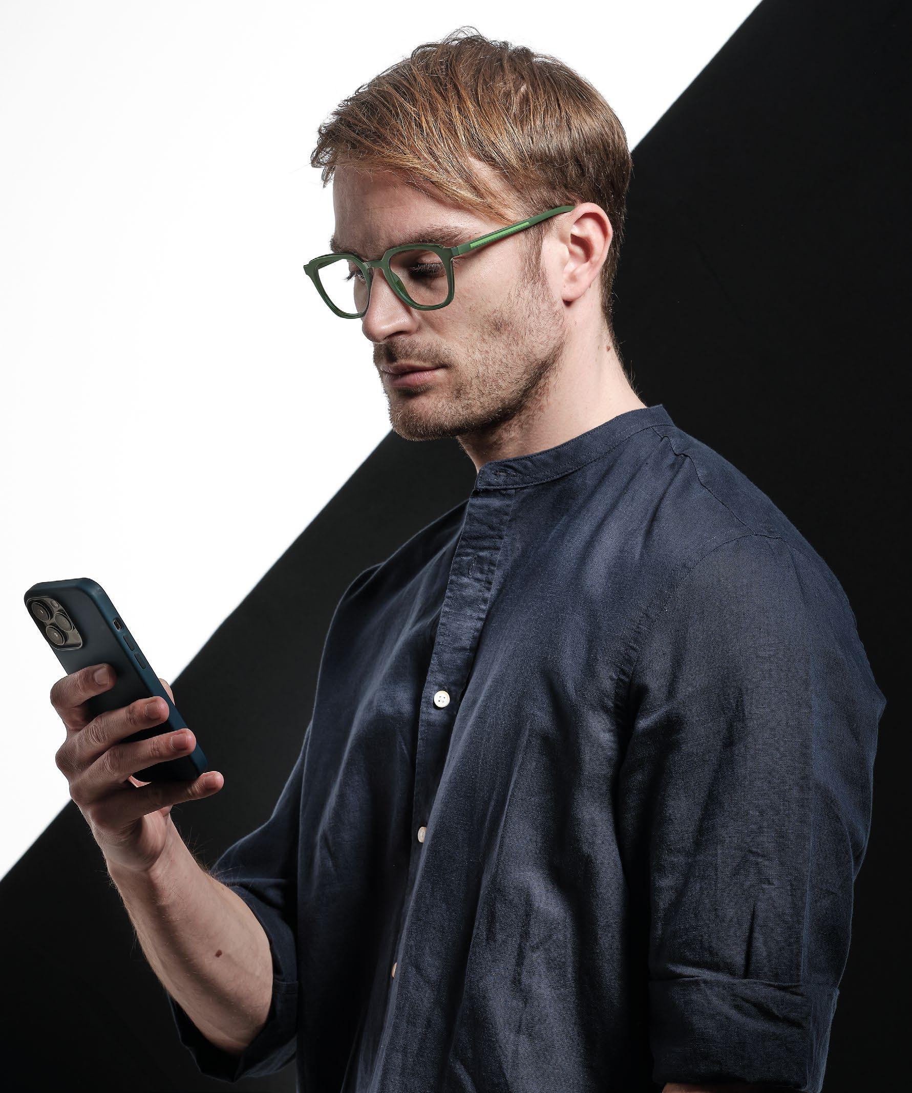 Inspired by the City Life district that boasts futuristic skyscrapers, parks and design houses, the Milano reading glasses collection is presented with an attractive design obtained with elegant facets and bright colors. The lenses with blue light filters are designed for device reading. Available in 4 colors with metallic finish accompanied by an elegant matching clutch bag.