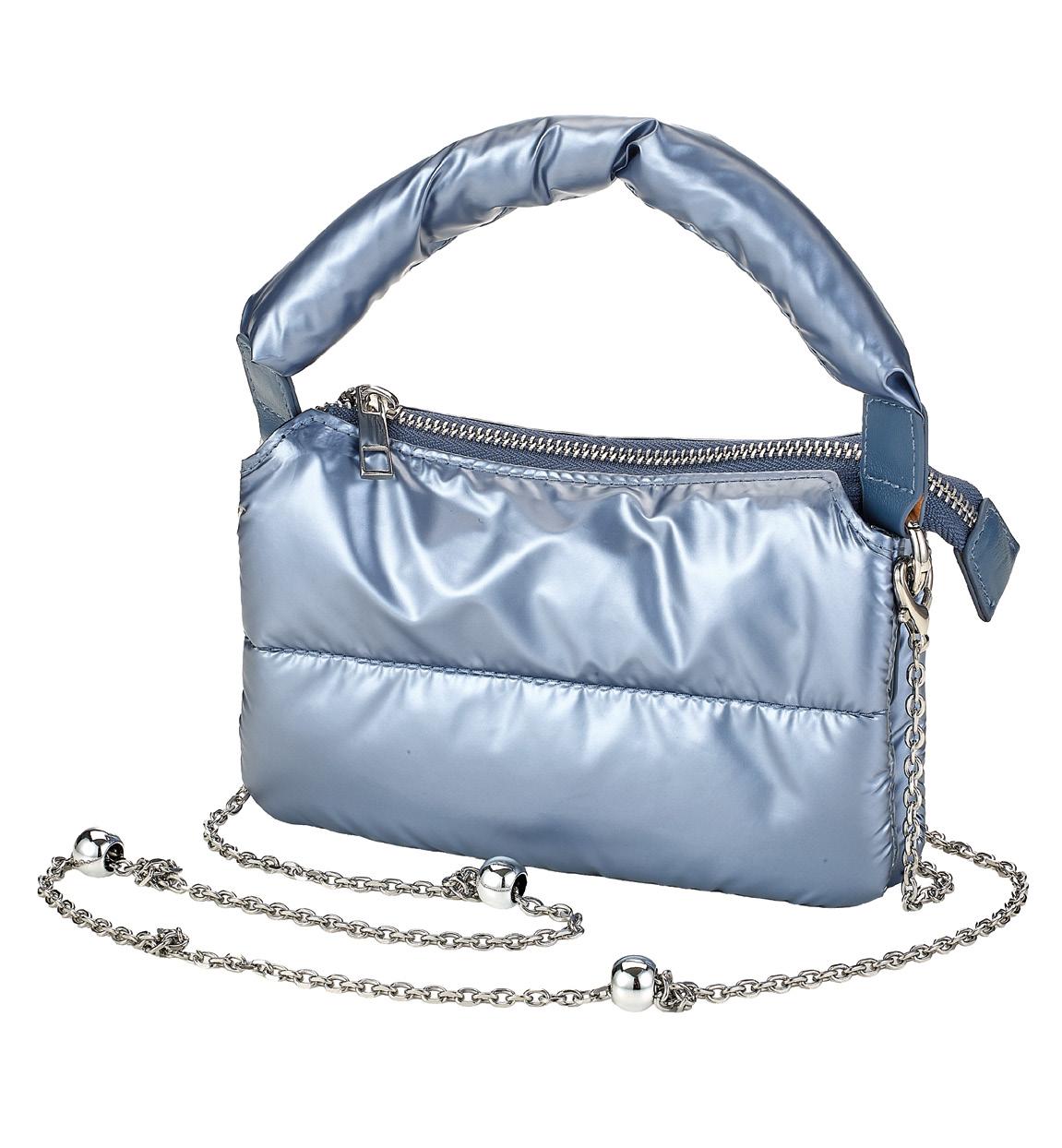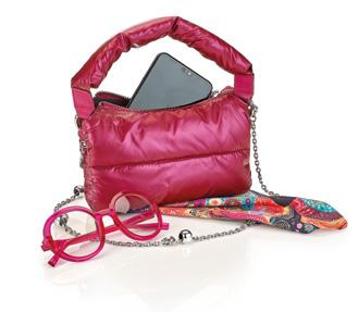 Mini bag with a removable metal strap, made from a ‘puffer’ effect material. It has three compartments. It is ideal for holding eyeglasses, sunglasses and other personal items. A gift idea with style.