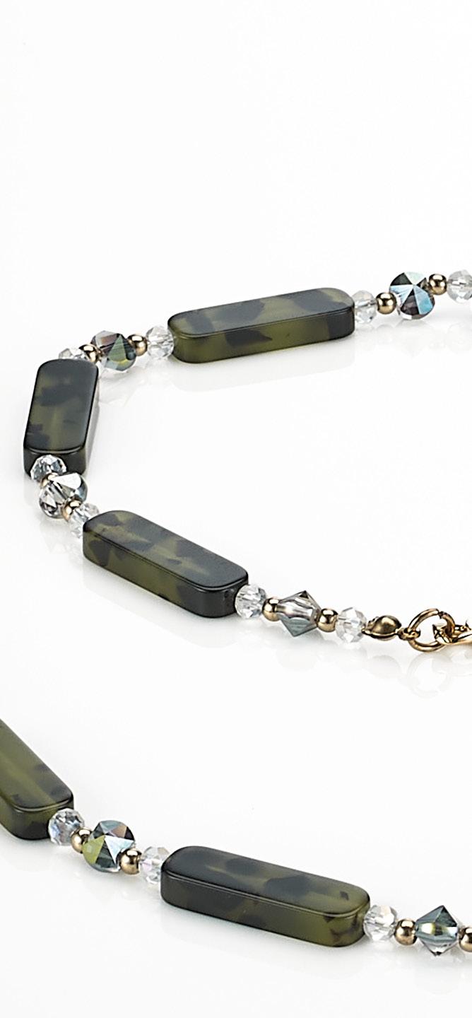 6 catenelle in acetato (2 pezzi di nero e beige, 1 pezzo di verde e marrone). Complete di pochette in microfibra. Ref. 10038