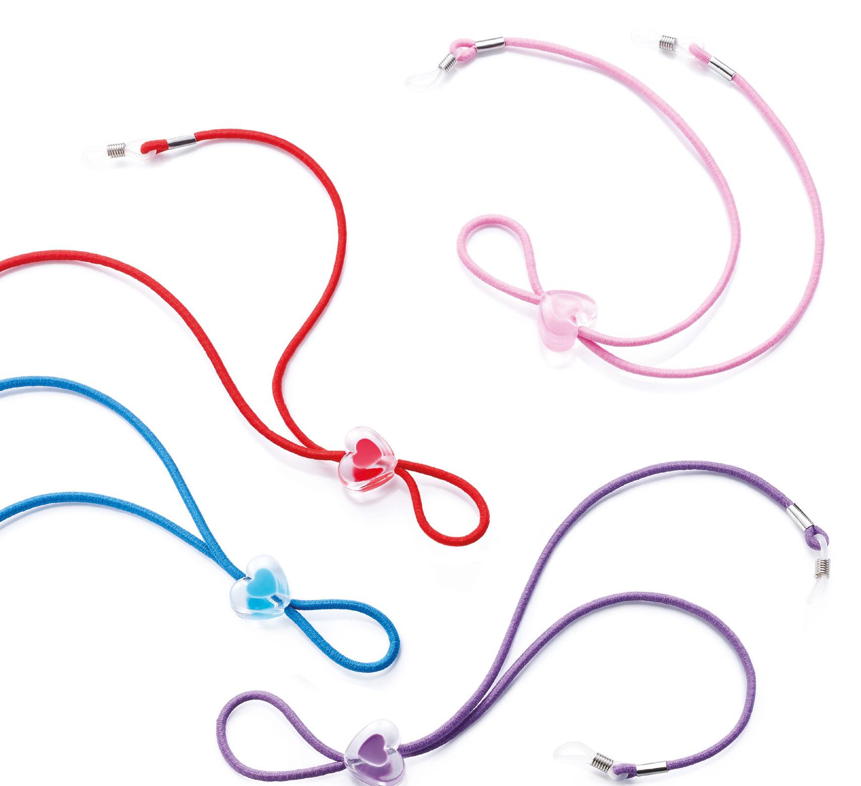Cordoncini per occhiali da bambini con cursore per la regolazione a forma di cuore, con finiture in metallo nickel free.