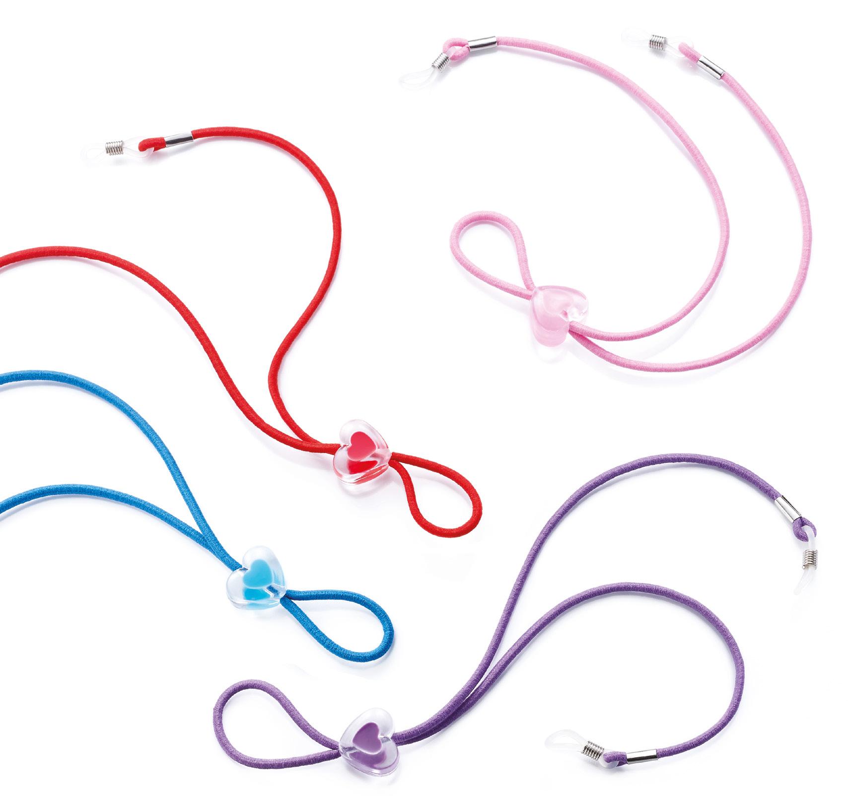 Cords for children’s glasses with heart-shaped adjustable slider, with nickel free metal finishing.