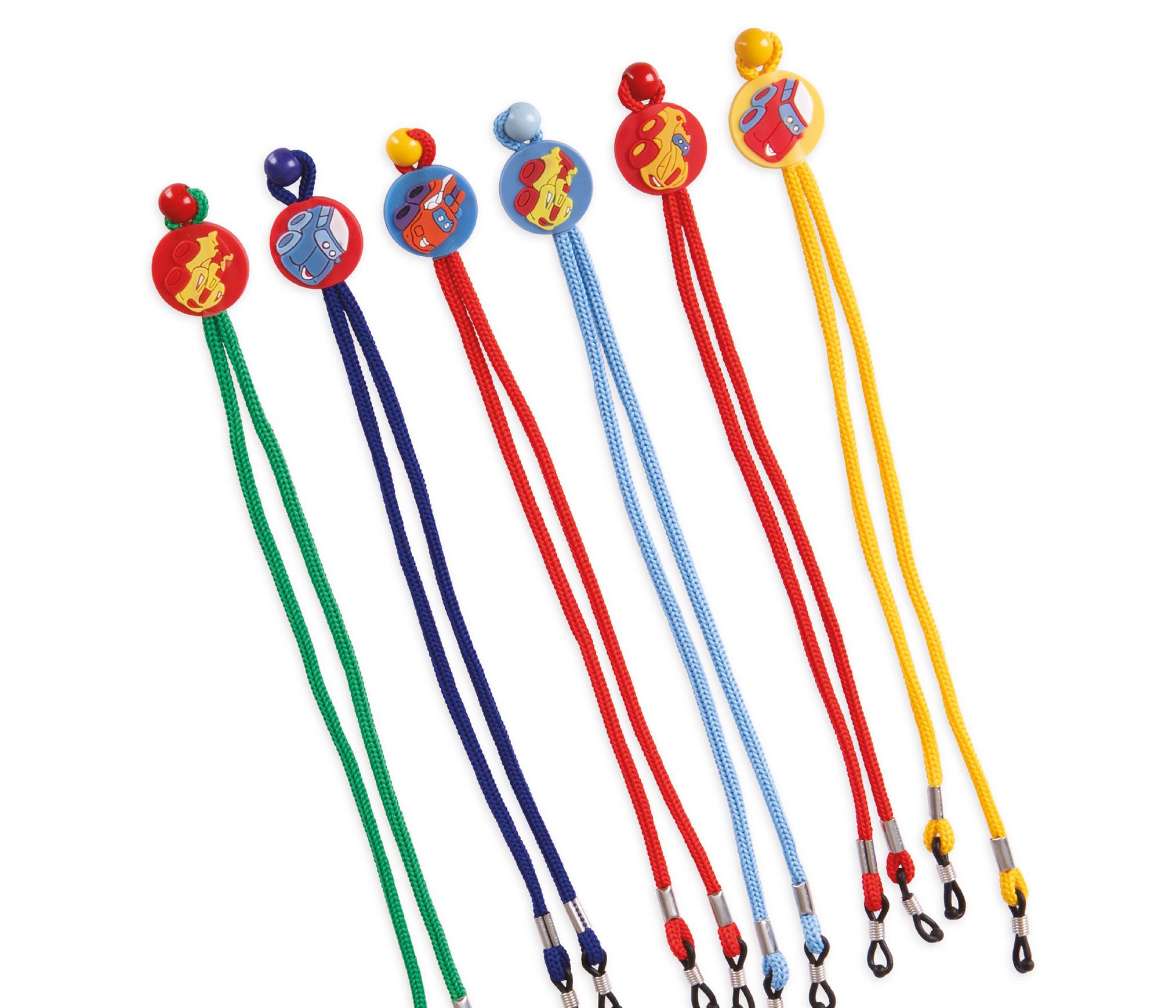 Cords for children’s glasses with balloon-shaped adjustable slider, with nickel-free metal finishing.