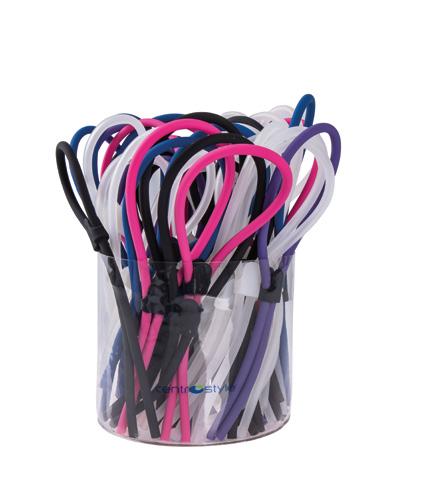Eyeglass holder in hypoallergenic silicone, adjustable and shorten to size to maintain the correct optical centre. Suitable for sunglasses and sports glasses.