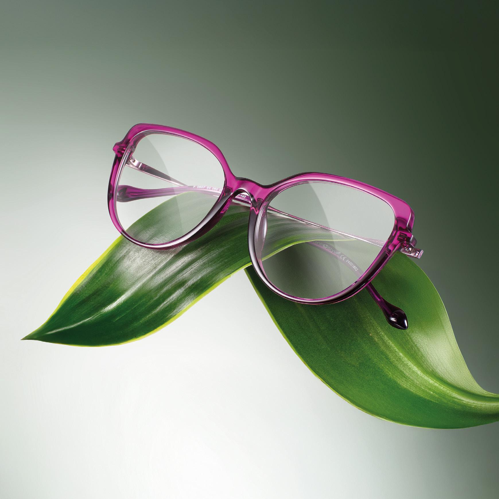 Montatura da donna, sottile e leggera. Frontale realizzato in Rilsan , poliammide biobased derivato dall’olio di ricino, aste in betatitanio , materiale leggero ed ipoallergenico e terminali regolabili in bioacetato , realizzato a partire da fonti rinnovabili.