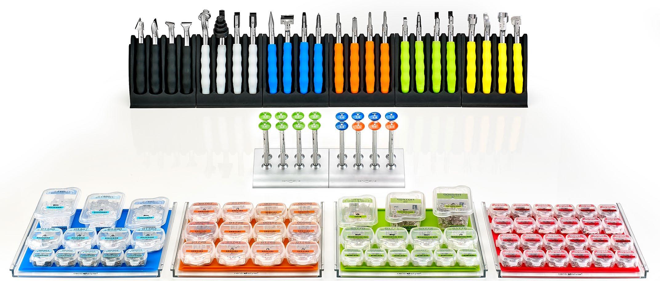 Una selezione di strumenti più ampia rispetto all'Essential Kit, indispensabili per un piccolo laboratorio o per rispondere al meglio alle principali esigenze quotidiane di un negozio di ottica. Comprende 2 cubi, 9 vassoi con un assortimento di parti staccate, più 1 vassoio con un kit di utensili per aste flex, un set di 15 pinze con porta pinze, 1 set completo di cacciaviti e 1 di giradadi, terza mano, confezione di pennarelli per marcare le lenti e una serie di utili prodotti in silicone.