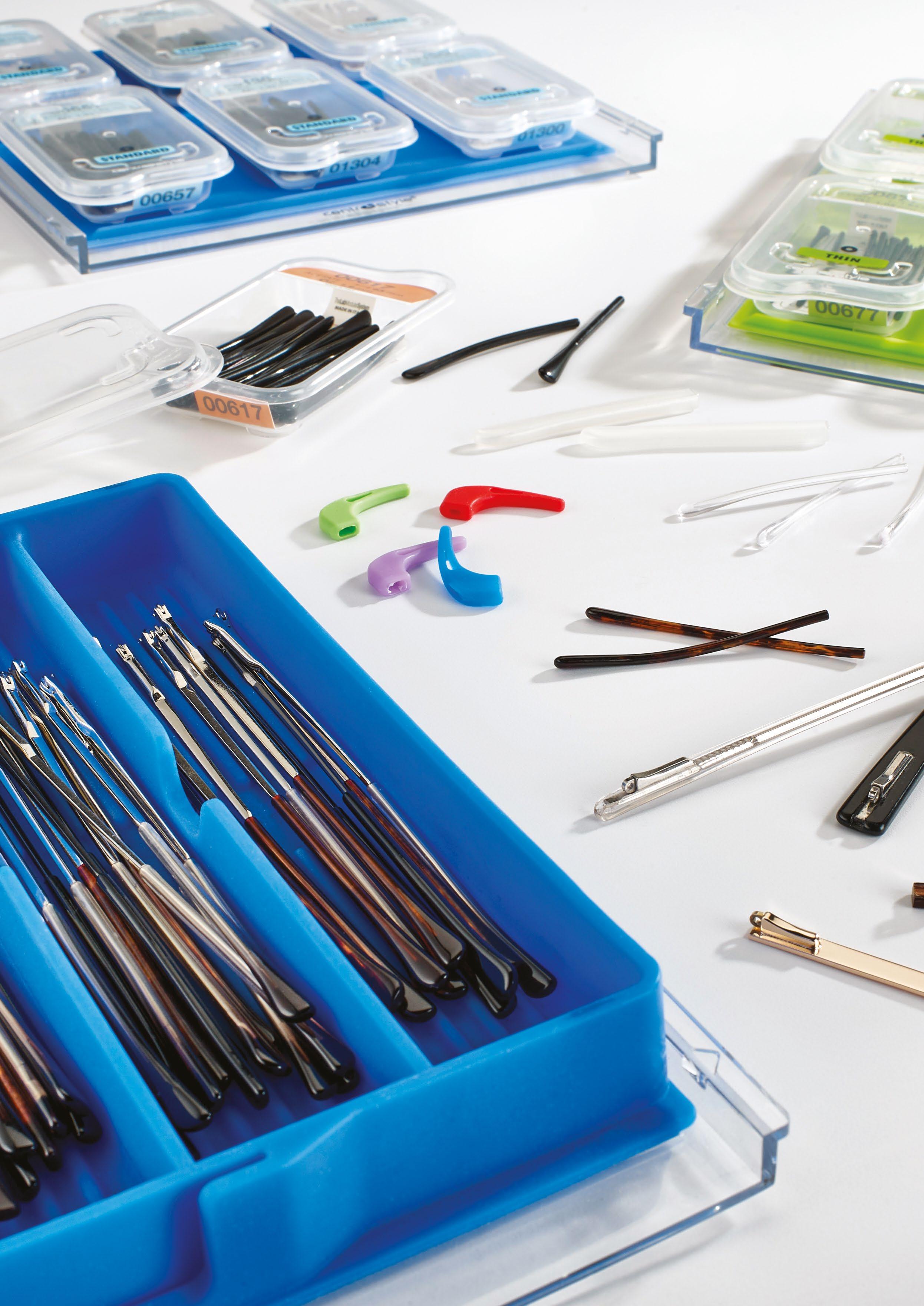 A comprehensive selection of tools and supplies for labs who handle the most complex and varied frame repairs or adjustments. Includes 4 organizational cubes, 19 trays fully stocked with frame parts, plus 1 tray with spring hinge tool kit, 26-piece plier set with stands, complete screw and nut driver sets, third-hand, portable clavulus, pack of AR markers and an array of silicone working aids.
