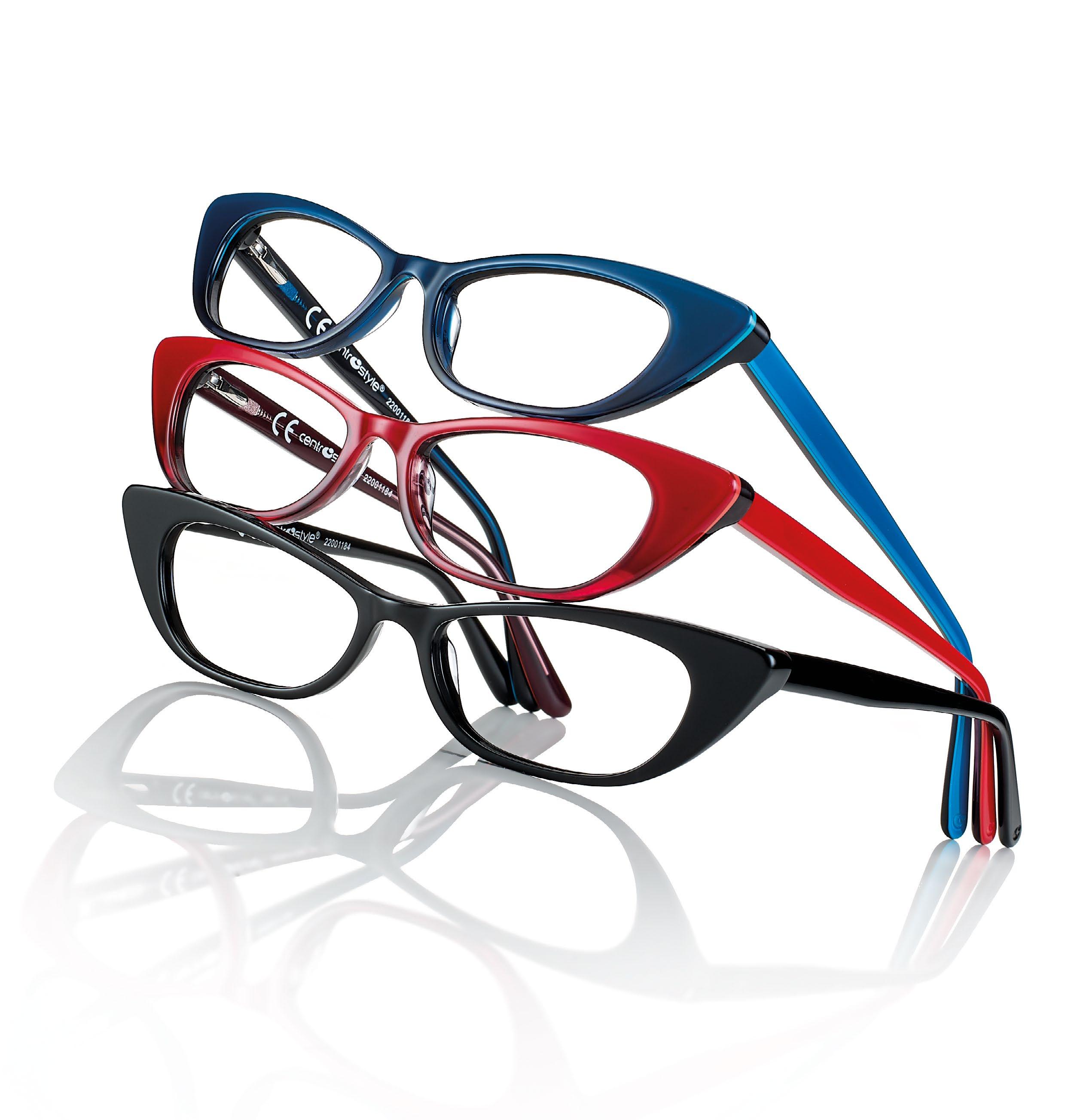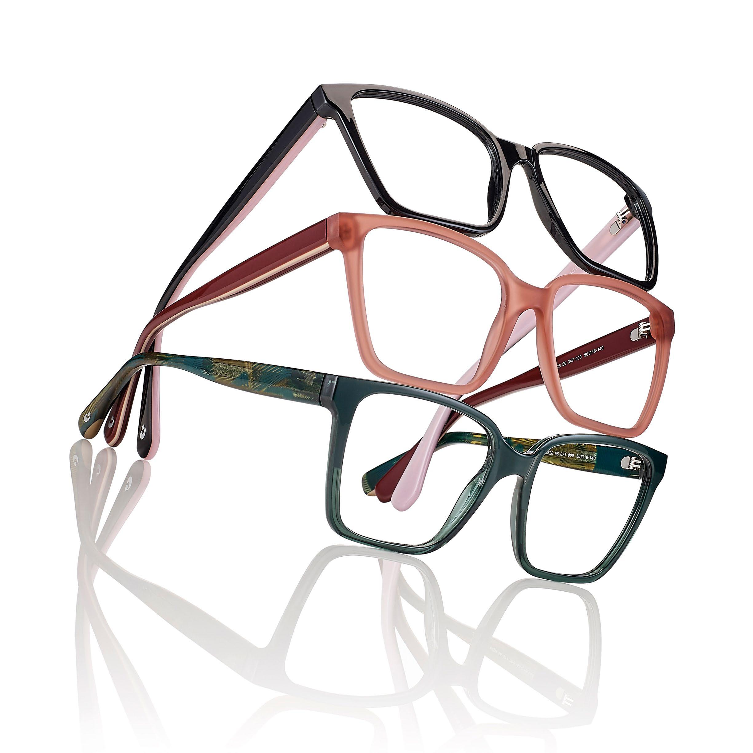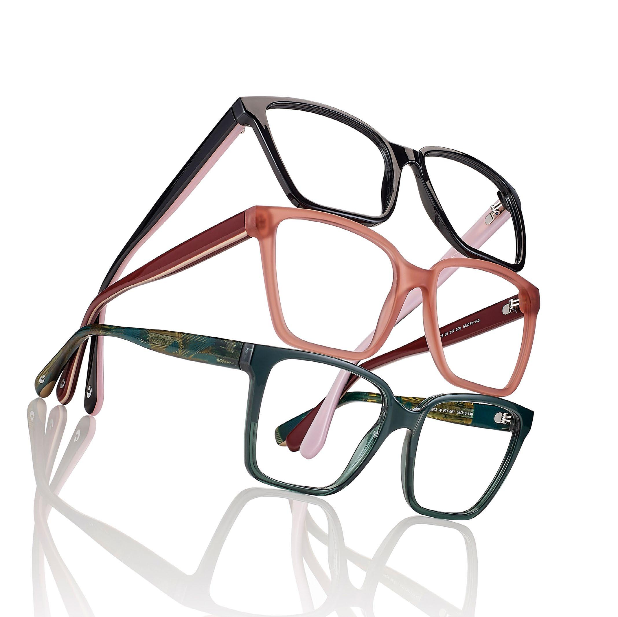 • Womans’ hand-made acetate frames, with rims thick enough to accommodate even high power lenses.