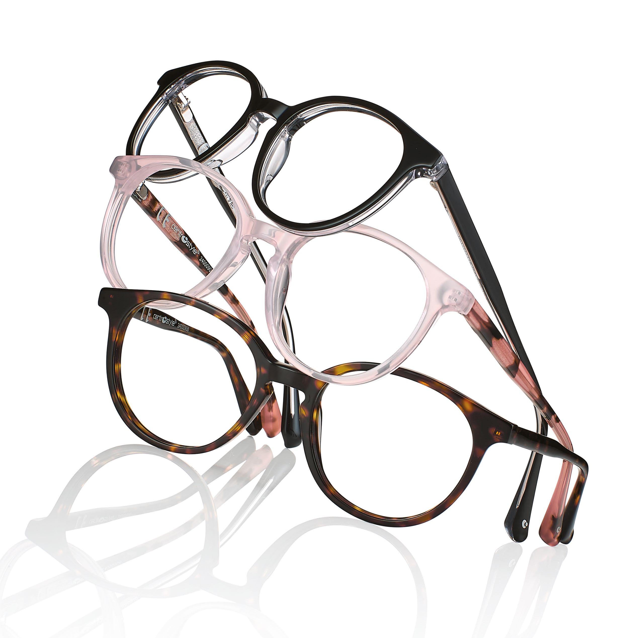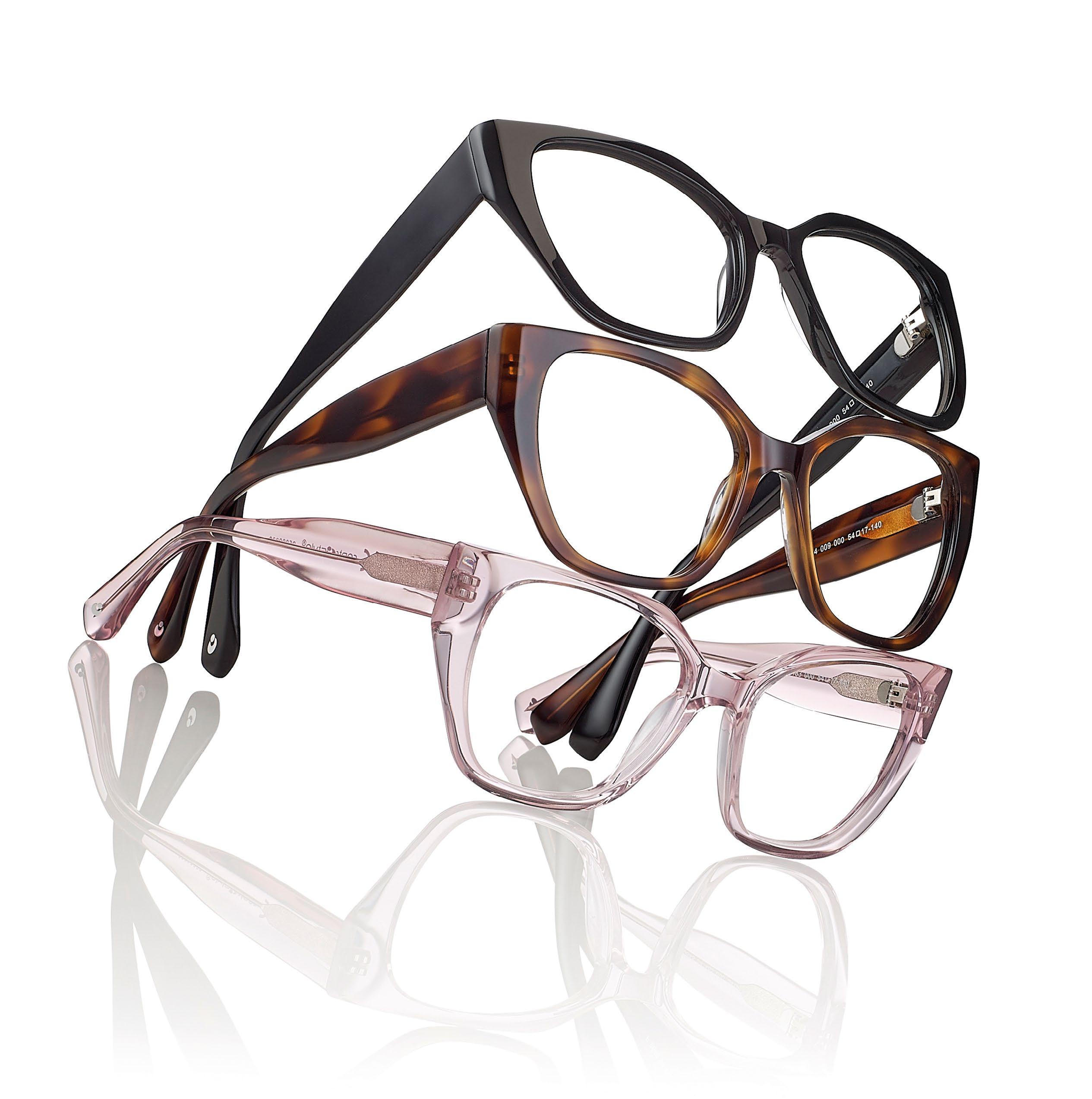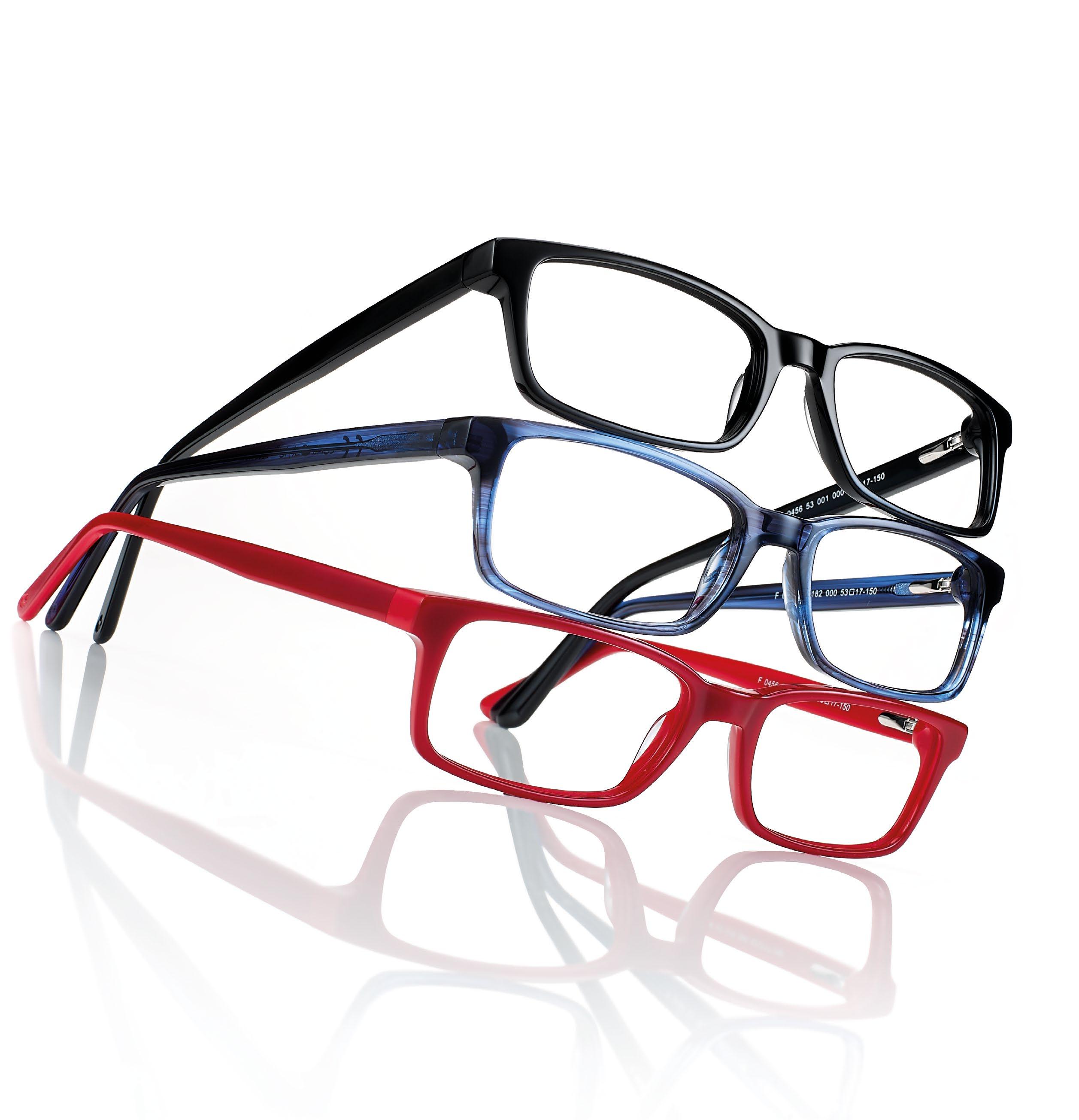 • Womans’ hand-made acetate frames, with rims thick enough to accommodate even high power lenses.