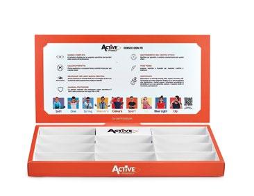 Espositori per la presentazione di montature Active, adatti sia per l’esposizione da banco che per la vetrina