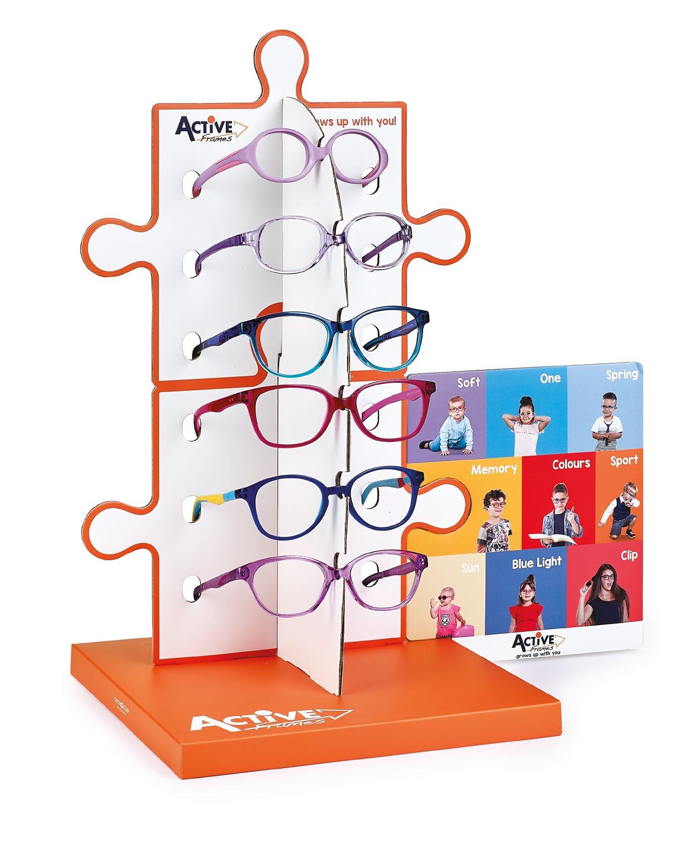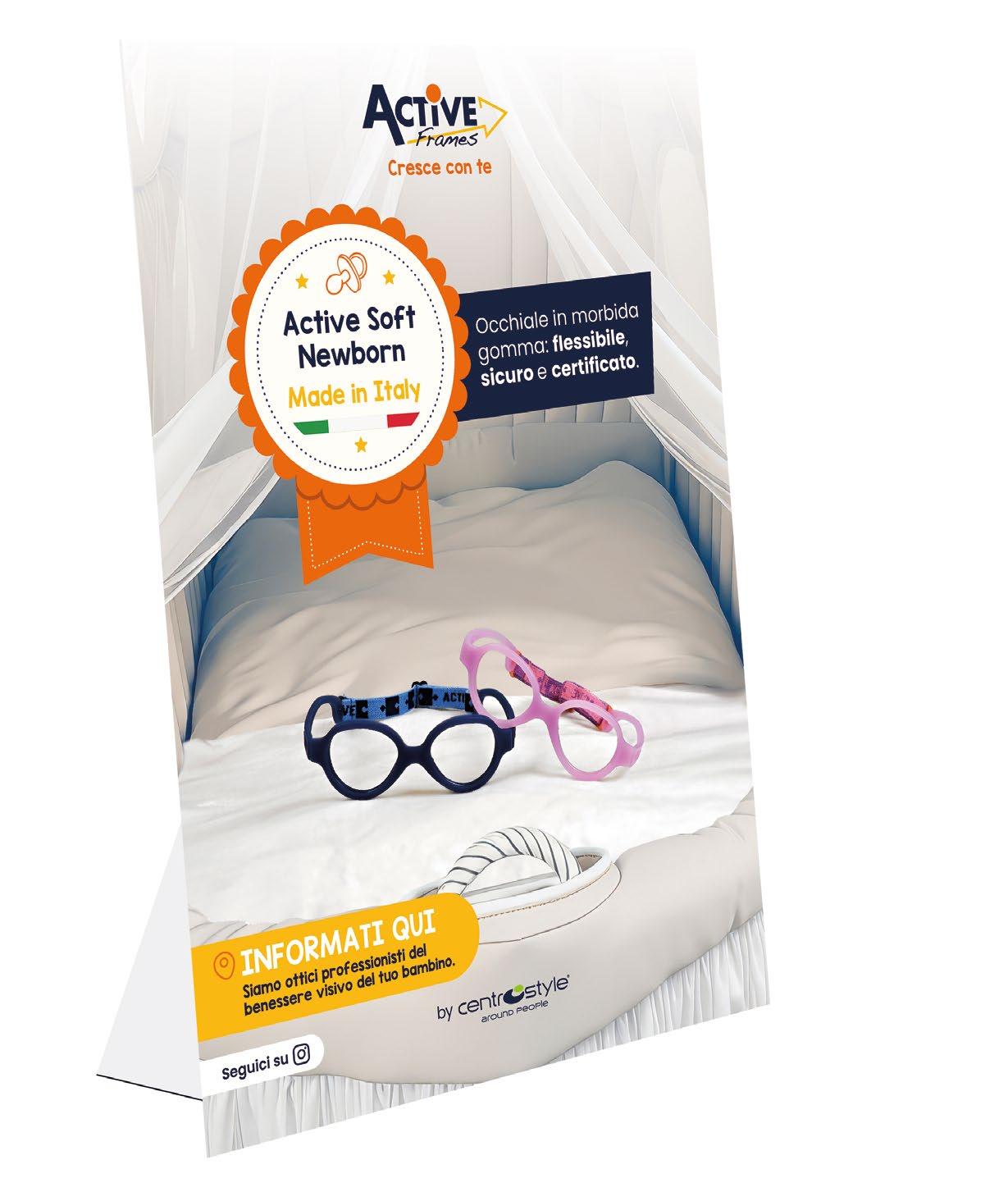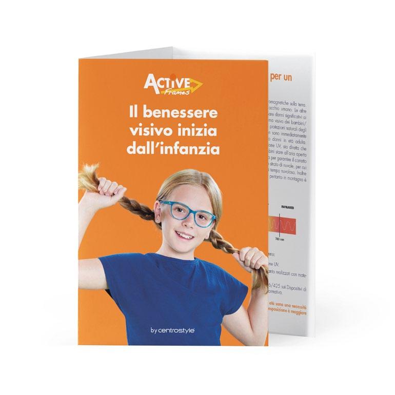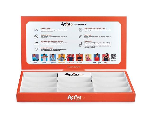 In omaggio con l’acquisto di 10 montature a scelta Comprensiva di comunicazione riguardante i punti di forza comuni a tutte le collezioni Dotata di uno spazio dedicato alle collezioni per la prima infanzia (Active Soft e One).