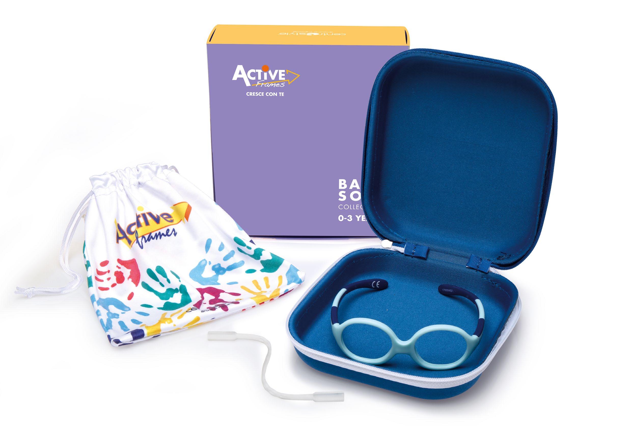 The child in this age group has a nasal septum that is not yet formed and needs to wear anatomically correct, stable, soft, light and safe glasses. Active Frames offers only frames made with soft and safe materials to allow movement. It is important that the eyewear always remains stable to ensure the correct maintenance of the optical centre position even when the head rests on a pillow, for example, in the cradle. For this reason, a cord always accompanies Active Frames.