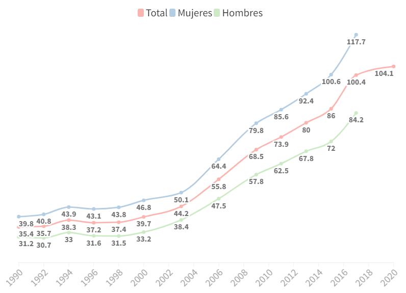 c Distribución de la población total según tipo de cobertura de salud por sexo, 1990 2020 38
