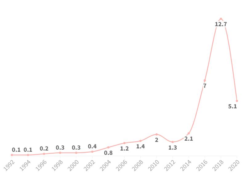 SJM(s f) Evolución de cantidad de Matrícula Migrantes en Sistema Escolar Chileno y Porcentaje que Representa en relación al total de matrículas por año. Migración en Chile Servicio Jesuita a Migrantes Recuperado de: https://cutt.ly/LCtwjHo