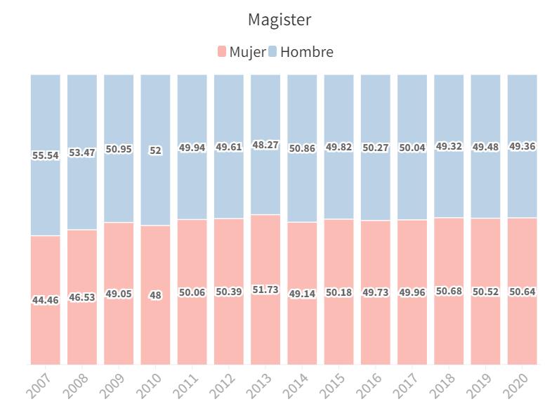 Observa (Varios Años) Porcentaje de mujeres matriculadas en pregrado, magíster y doctorado. Años 2007 2020. Chile. Recuperado de: https://cutt ly/lCtwwUN