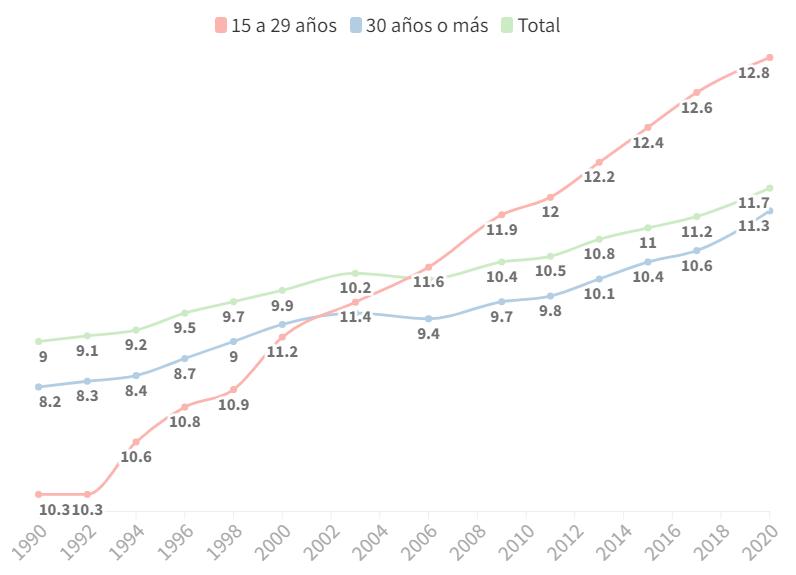 a. Promedio de años de escolaridad por tramo de edad, 1990 2020............................................................................36