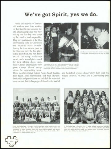 We've got Spirit, yes we do. While the majority of Centennial students were busy working on their tan this past summer, the CHS cheerleading squad was busy making sure that they could pump up the crowd as much as possible. They were participants at the UCA cheerleading camp in Charleston and received many awards. Among the team awards given to the Chargers were the first place Julie Bauer and Tamara Diorio sho11 just how close a year of cheerleading, camps and practice can make two friends. in the floor cheer, the best dance award, the camp leadership award, and a second place award for their sideline cheer. Also, this year a real!) great e\perience for me and I had a lot many Charger cheerleaders were of"Cheerleading fun. I wouldn't ghe up any of those moments ... e\cept f01 maybe the times that I happened to falL" -Senior Staq \\alton (sh01111 11ith her given a camp "all-star" recog- fe11 mother dUJing the senior cheerleader ceremony before a football game). nition for outstanding work. Those members include Kristin Pierce, Sarah Buckius, and basketball seasons ahead where their spirit was Julie Bauer, Jenni ierstheimer, and Ryan Me eilly. needed the most Ms. Stacy Arie is Cheerleading SponDedication and perseverance not only left the team with sor. many awards, but it also prepared them for the football wa~