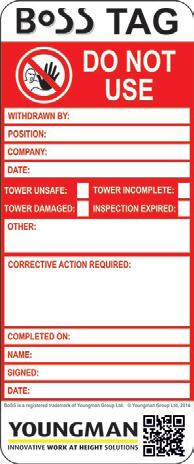 To be displayed on a harness strap giving identification and inspection details. These are often colour coded giving ‘at a glance’ safety information from a distance.