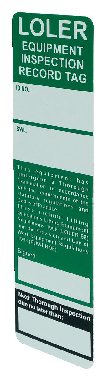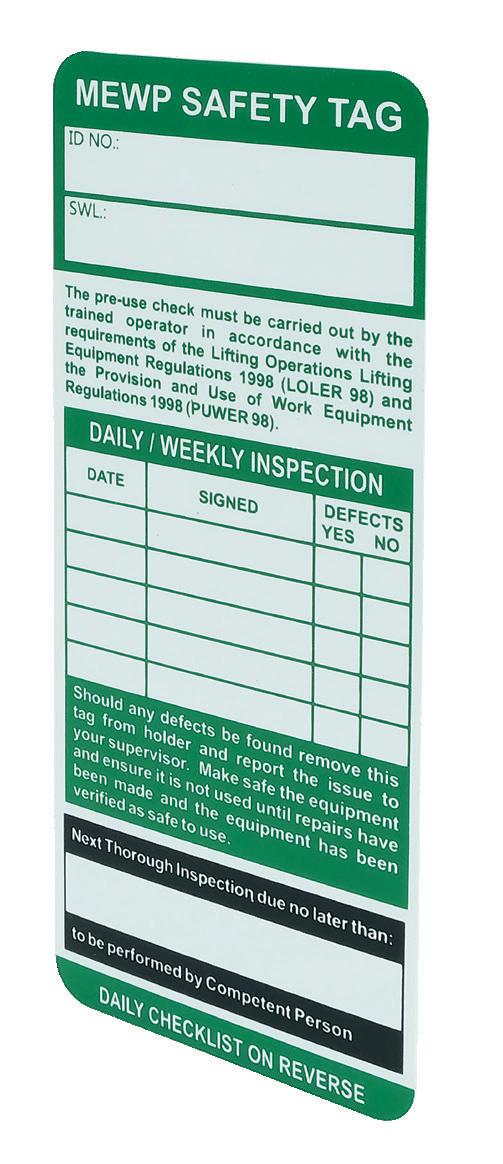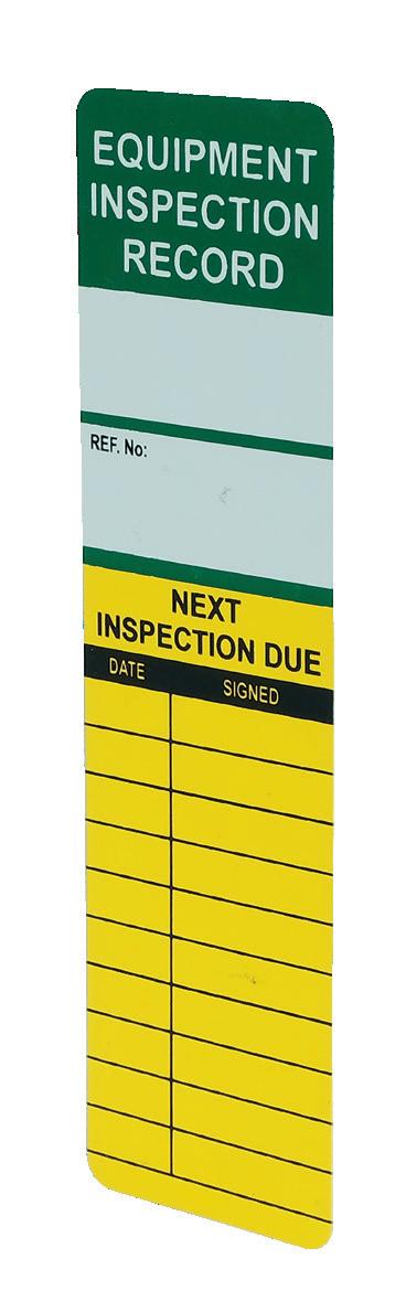The insert has clearly defined areas to record equipment identification or reference numbers, alongside an inspection record. This allows a user instant access to important safety information. Should equipment fail, the tag can be removed to clearly display the message ‘Do Not Use This Equipment’ which is printed on the holder. Description