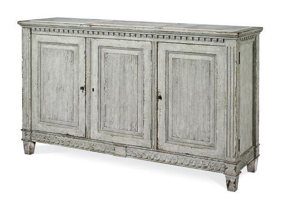 Worn light grey paint finish with Gold leaf accents on Beech solids with Textured linen upholstery