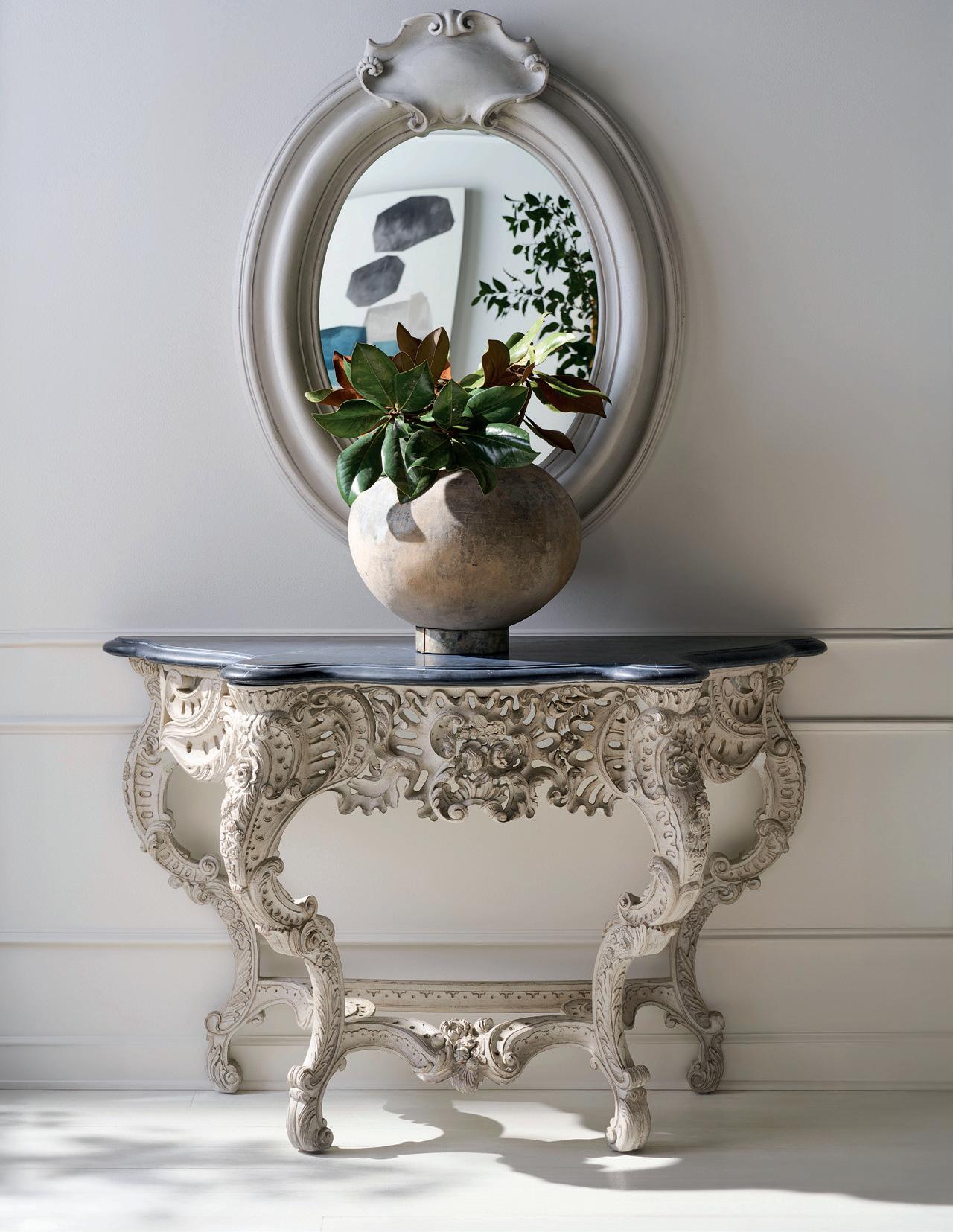 Clear mirror with hand carved framing nished in a French Painted Blanc