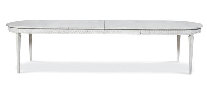Re ecting the Gustavian style, this dining table is characterized by its emphasis on simplicity, light colors, and delicate decorative details, such as the bead and reel motif, which add a re ned elegance.