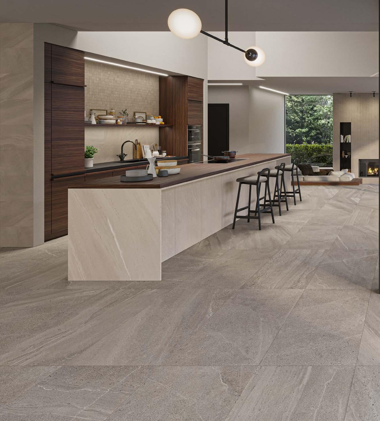 Teintes naturelles et veines fines caractérisent Journey, dont les nuances offrent la possibilité de créer des espaces chauds et confortables.