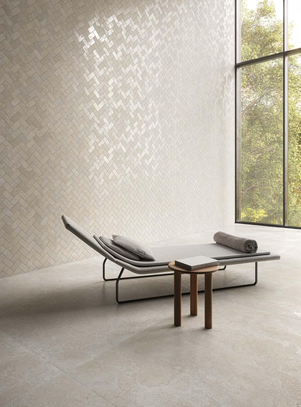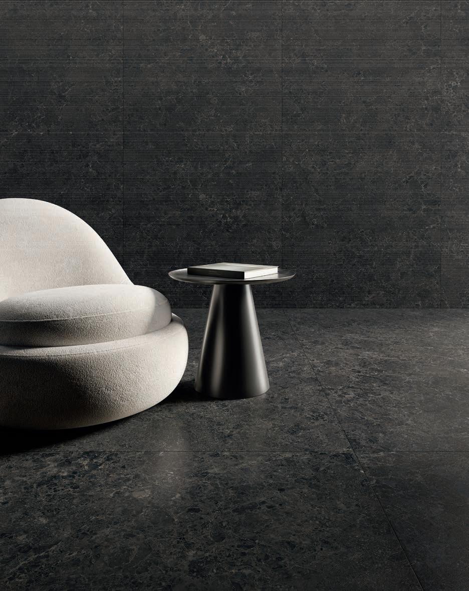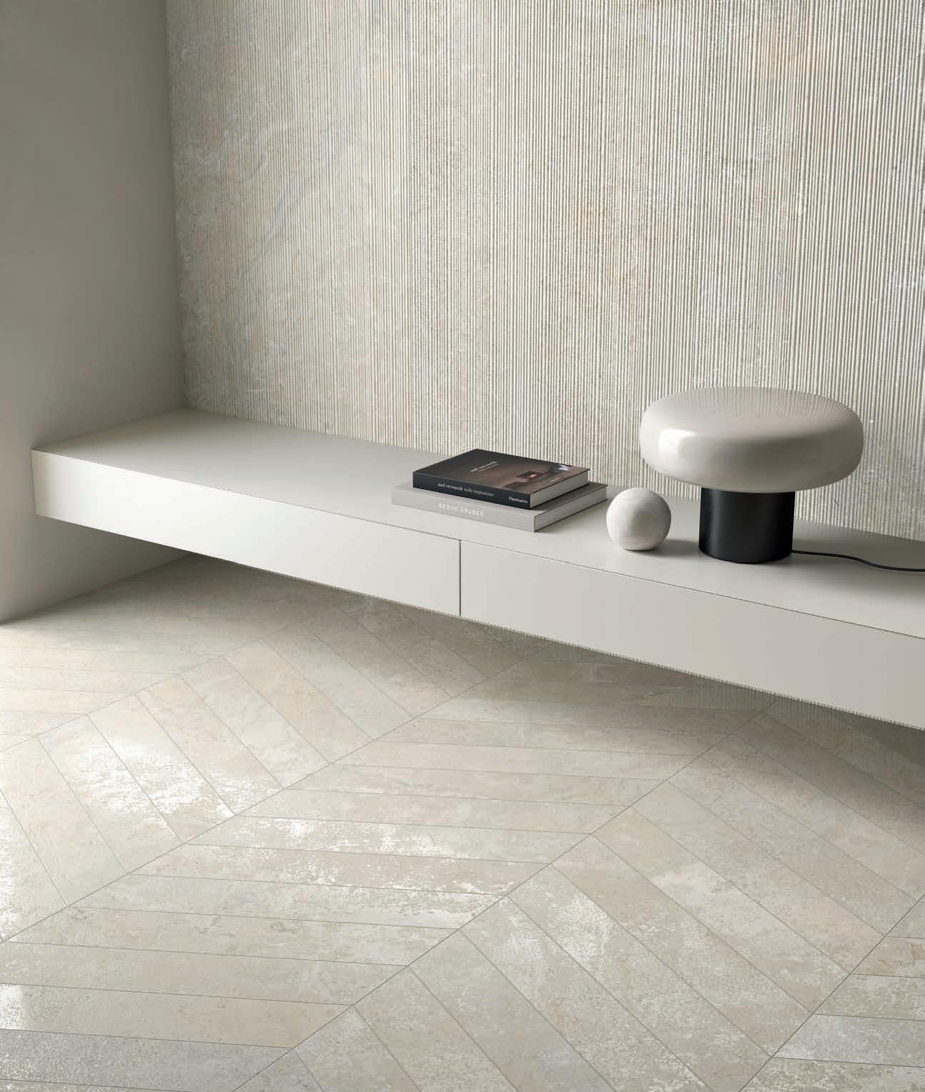 collezione si arricchisce di una struttura, Ribbed, che richiama la lavorazione manuale della pietra, donandole un aspetto vivo e contemporaneo, creando una texture moderna dove si intersecano luci e ombre.