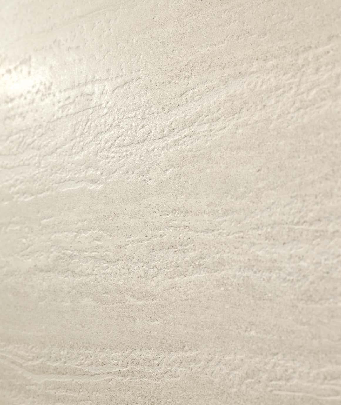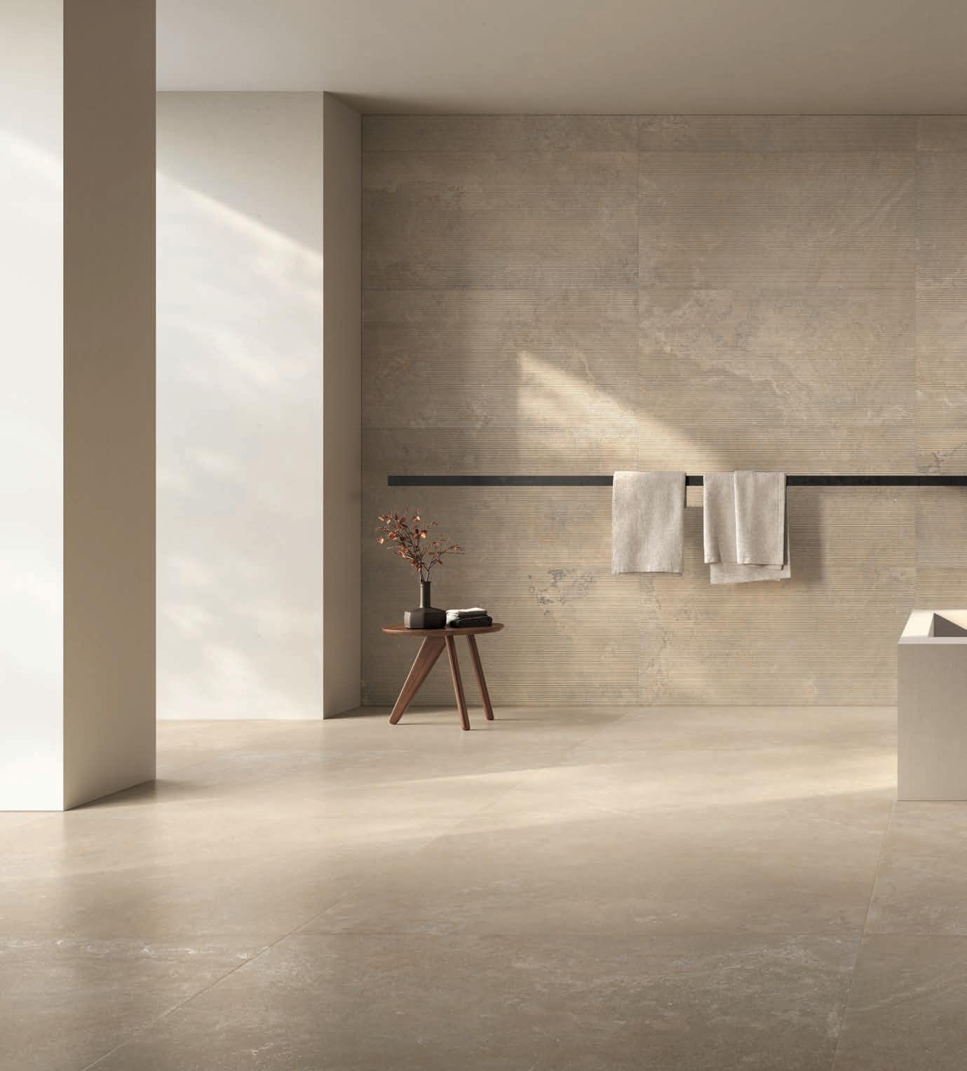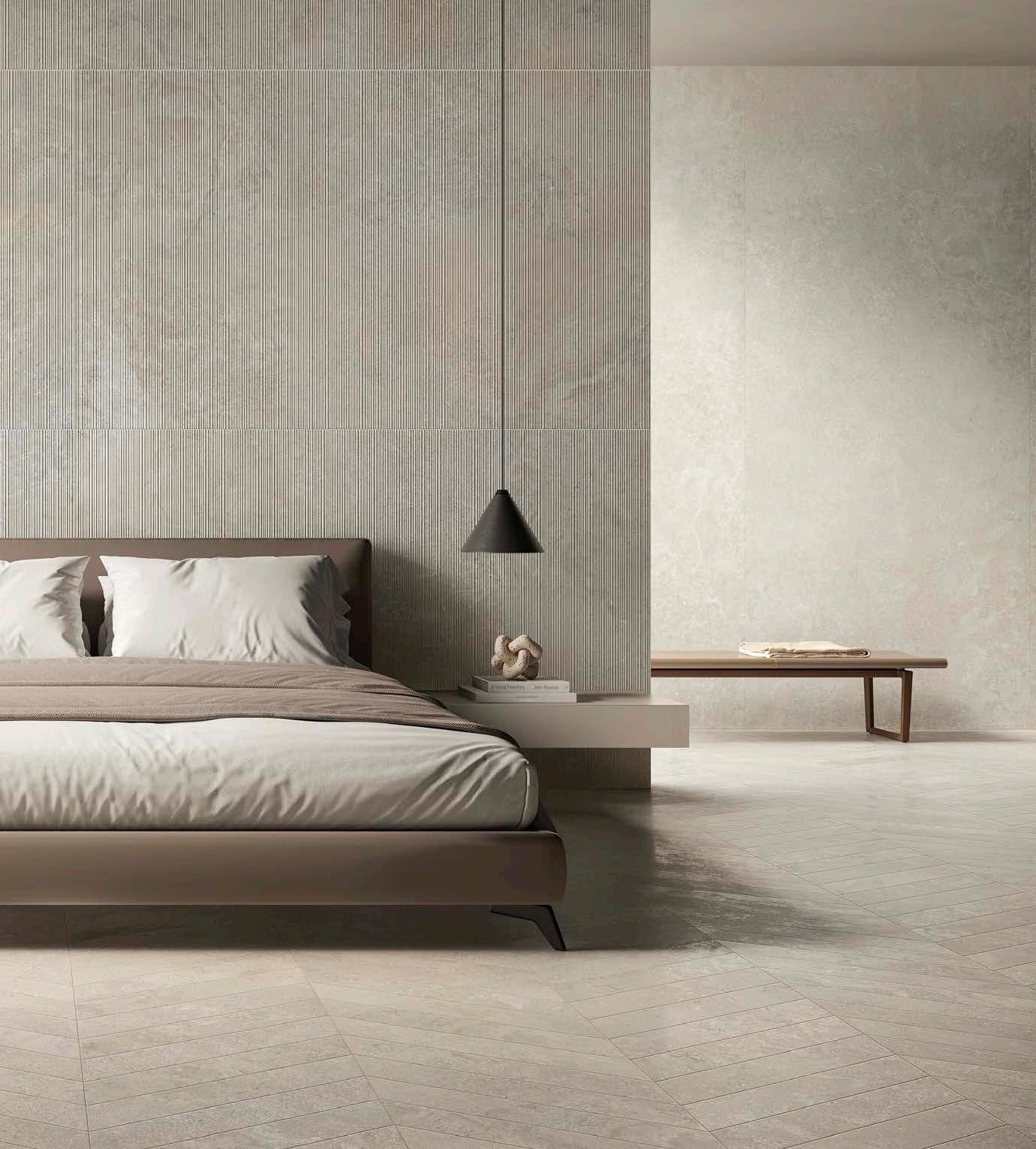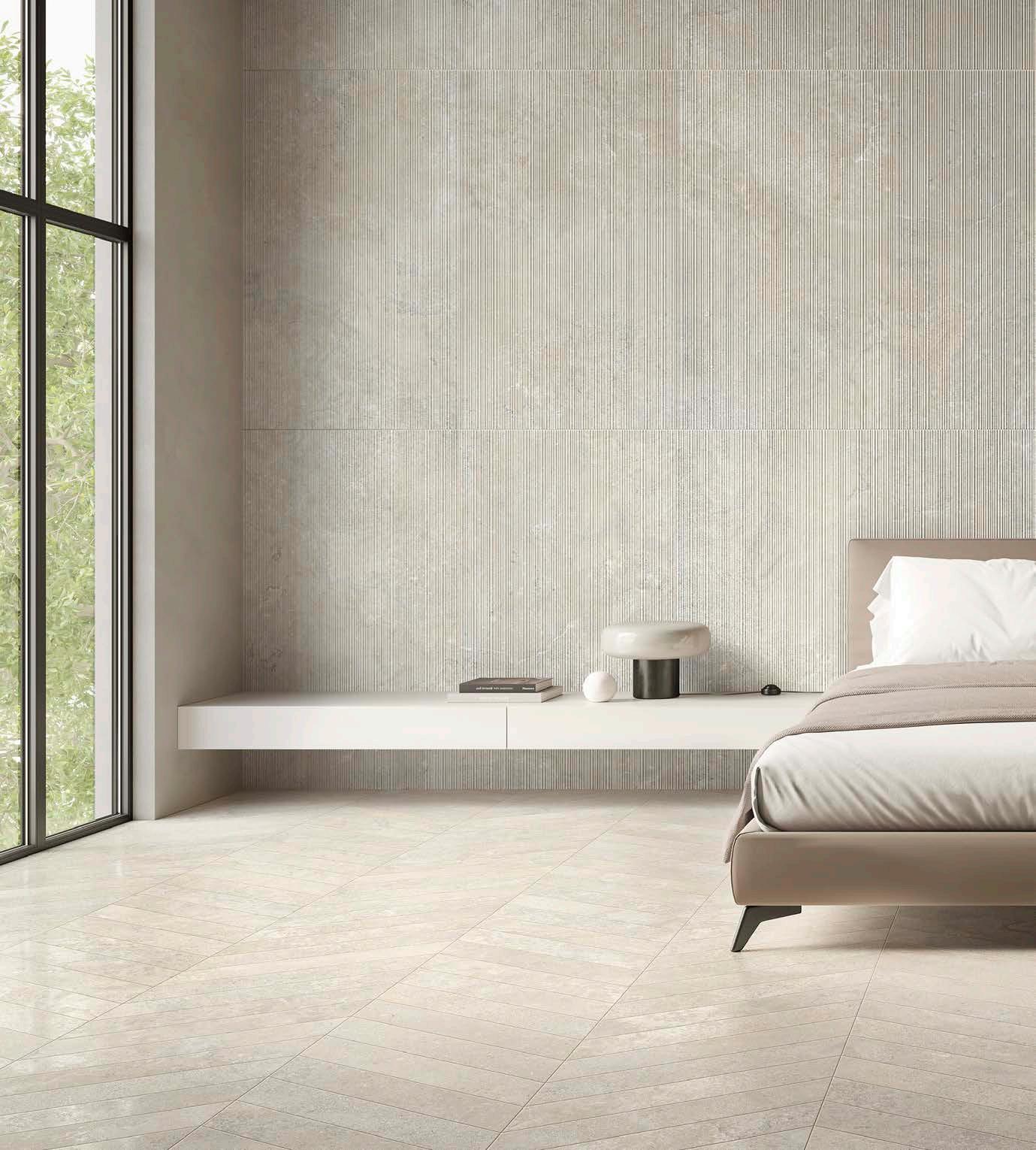 Die Kollektion wird durch eine Struktur namens Ribbed erweitert, die die manuelle Verarbeitung des Steins nachahmt und ihm ein lebendiges und zeitgemäßes Aussehen verleiht. Dabei entsteht eine moderne Textur, in der Licht und Schatten sich durchdringen. Die Dreidimensionalität wird durch die Veränderung des Lichts im Laufe des Tages betont, wodurch der Raum eine geschwungene und kontinuierliche Bewegung erhält.