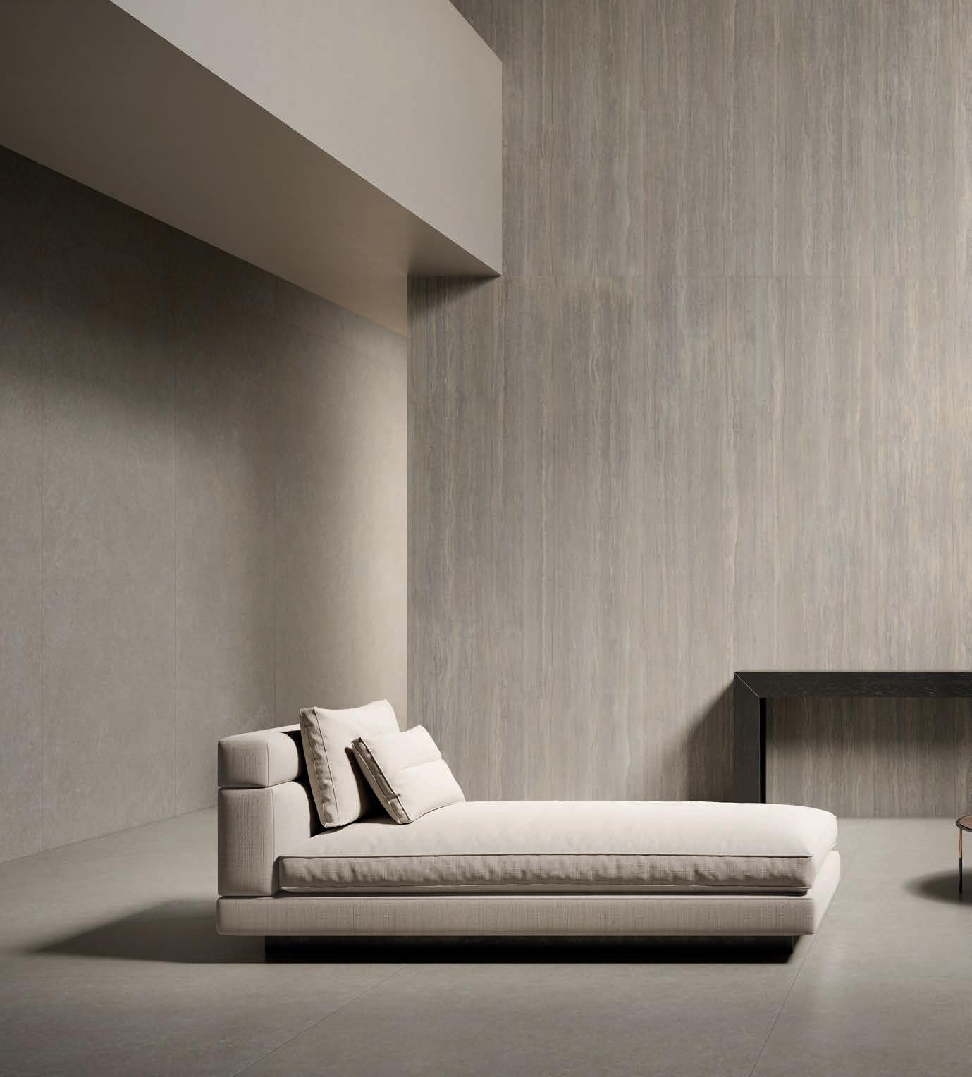 La collection s’enrichit d’une structure, Ribbed, qui rappelle le travail manuel de la pierre, en lui donnant un aspect vivant et contemporain, en créant une texture moderne où se croisent lumières et ombres. La tridimensionnalité est exaltée par le changement de lumière à différents moments de la journée, donnant à l’environnement un mouvement sinueux et continu.