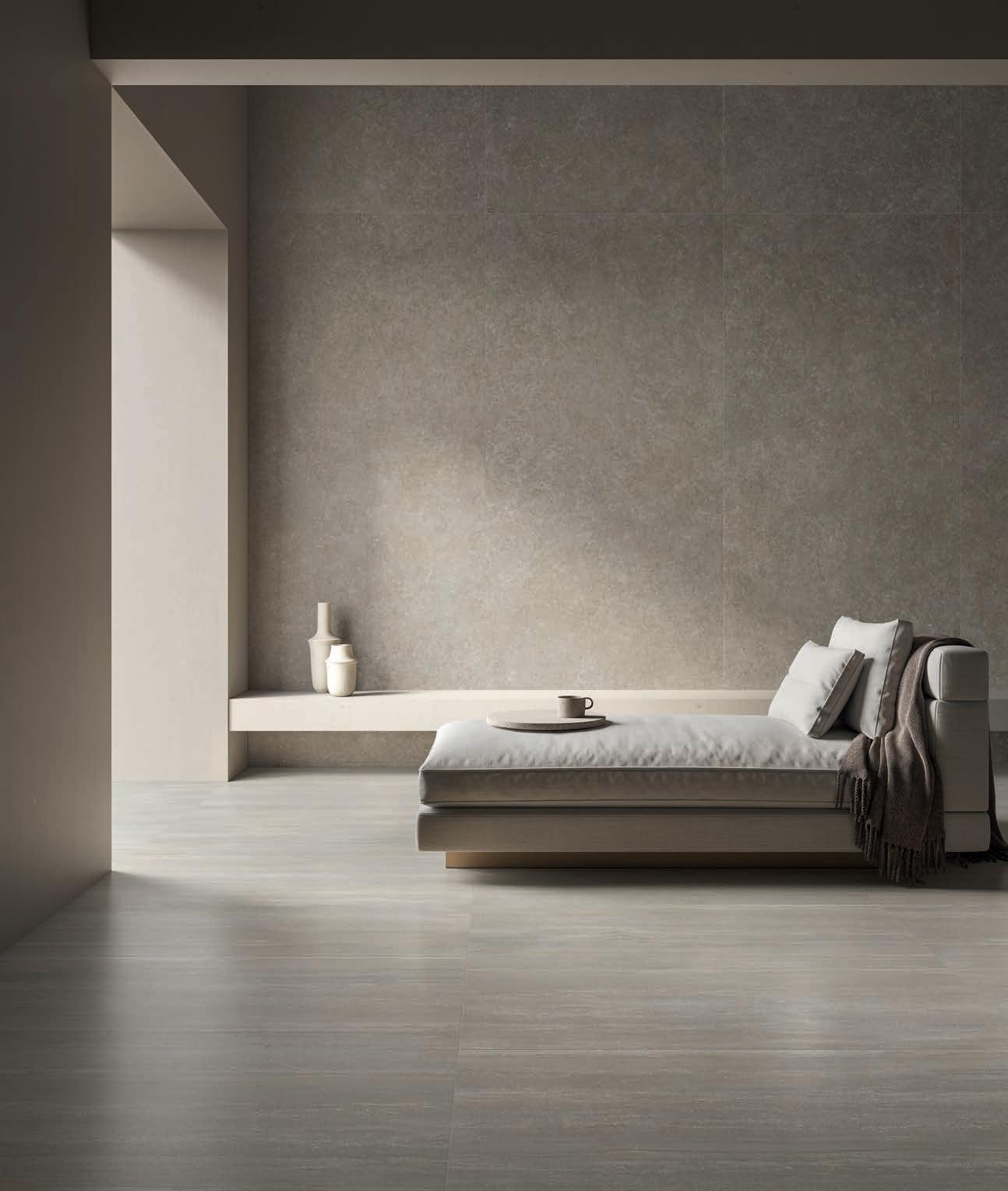 Le format 120x120 complète la gamme, riche de surfaces et de structures. Le choix esthétique idéal dans les espaces publics au goût contemporain.