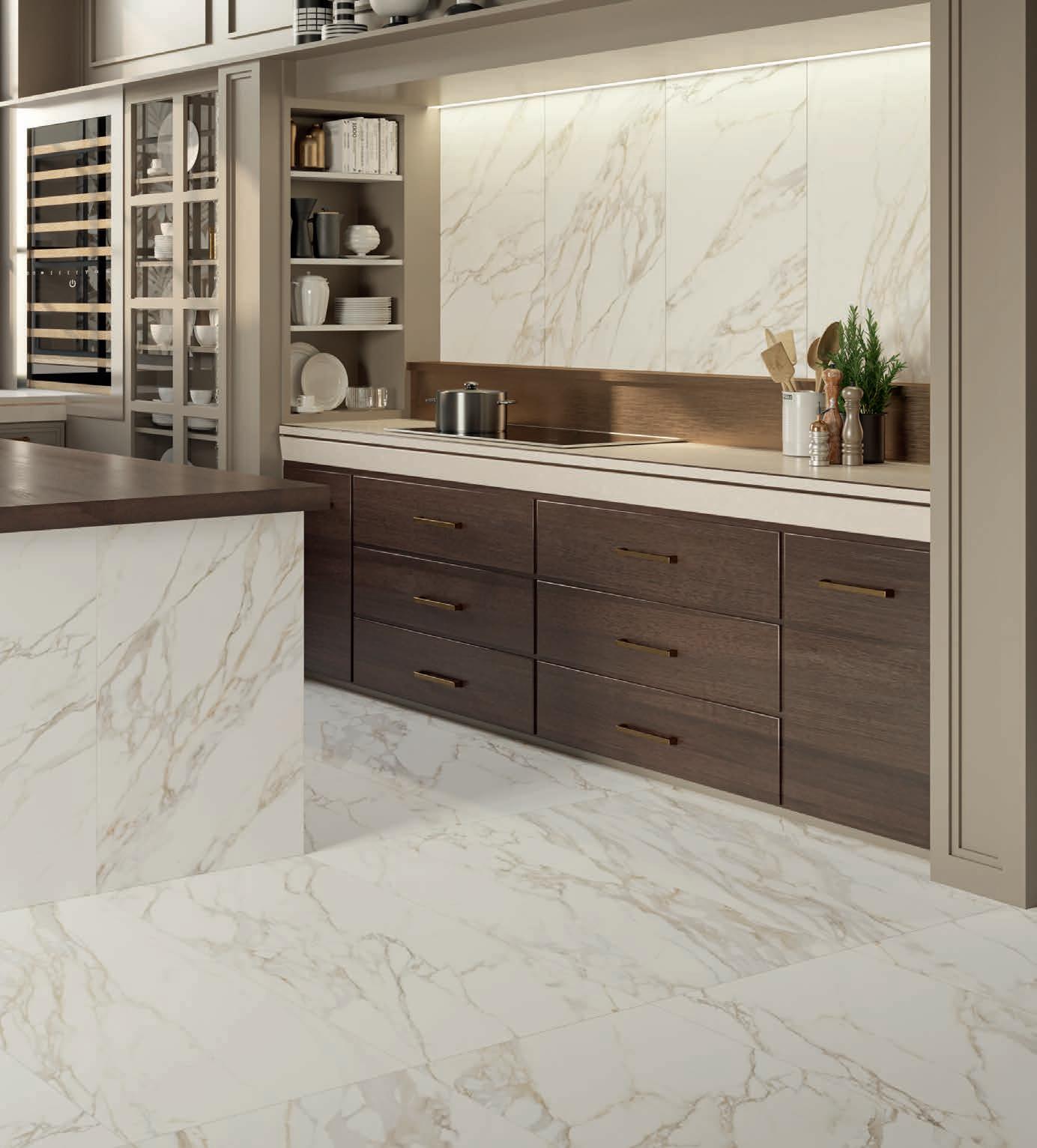 Die Reinheit der Weißtöne wird durch edle Zeichnung der vier schönsten und begehrtesten italienischen Marmore wie Calacatta, Statuario, Arabescato und Dolomiti betont.