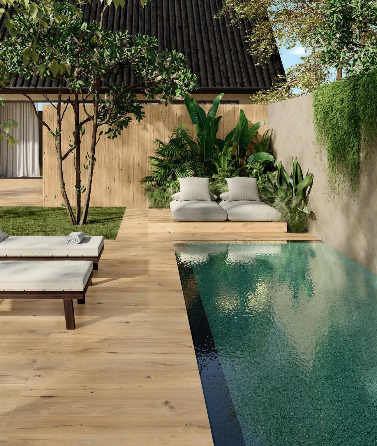 Für den Außenbereich und für die Bereiche am Pool ist Solorovere im Format 20x120 in den Ausführungen Flamed und Loft auch rutschfest erhältlich, somit wird die visuelle Kontinuität zwischen Innen und Außen gewährleistet.
