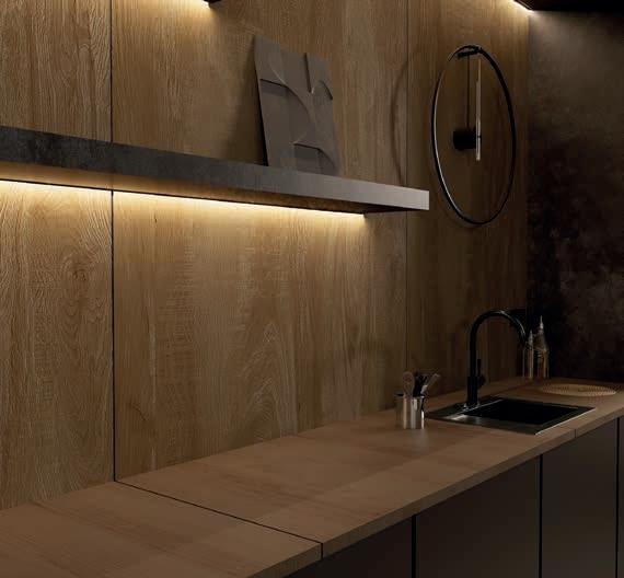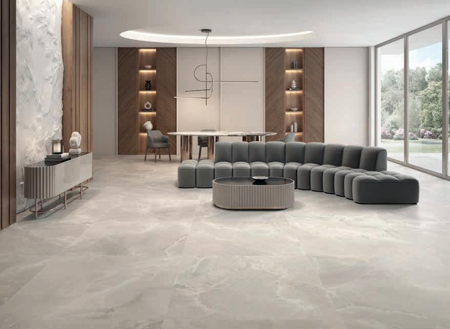 Por último, Opulis proyecta la cerámica hacia un estilo de vida dinámico, donde los excesos tienen su lugar. Las superficies son más brillantes, con reflejos metálicos y acabados de alto impacto que transforman los espacios en escenarios híbridos y versátiles. La cerámica se aplica en superficies y también en mobiliario, facilitando la transición entre distintas funcionalidades, con espacios conectados, armónicos y prácticos. Los tonos son más oscuros, fríos e industriales.