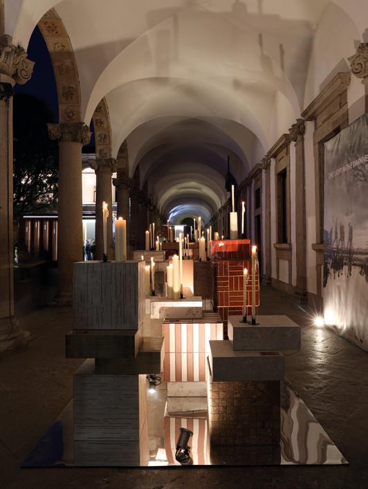 vom Klimawandel bedrohte Ressource darstellt. Auf dieser Oberfläche diente der Ton als Träger für die Kerzen, die Licht bringen. Wenn der Kreuzgang von La Statale bei Sonnenuntergang in Dunkelheit getaucht war, blieb die Installation dank des Lichts, das von den Keramikwänden reflektiert wurde, weiter sichtbar.