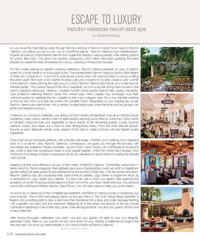 As you travel the meandering roads through the tony enclave of Rancho Santa Fe en route to Rancho Valencia, you realize you are on your way to something special. Rancho Valencia’s lush Mediterraneaninspired all-suite accommodations beckon the couple that desires a relaxing retreat while offering options for activity filled days. The resort has recently undergone a $30 million renovation updating the entire property to create the ideal atmosphere for a luxury wedding or honeymoon escape. For the couple seeking an opulent wedding celebration, Rancho Valencia presents an array of options suited for a small soirée or an extravagant event. The quintessential Rancho Valencia outdoor affair begins on their chic croquet lawn. Known for its spectacular sunset vistas, this spacious site is a canvas awaiting the artist’s paint. Rich dark wood, leather studded walls and wrought iron accents create a rustic warmth in the ballroom where dancing the night away is a must. Rancho Valencia also serves as a sweet spot for intimate parties. The Sunrise Terrace Patio flows beautifully out from a private dining room located in the ranch’s signature restaurant, Veladora. A bubbly fountain and exquisite Spanish tiles create a haciendastyle ambiance reflecting Rancho Santa Fe’s storied past. Here couples may exchange vows then welcome guests to celebrate the new chapter to their lives in elegant style. For a truly intimate wedding or shower, the Wine Cave sets the scene with candlelit charm. Regardless of your wedding day locale, Rancho Valencia provides brides with a centrally located bridal suite where the bride and her gal pals can primp and prepare in privacy. Wherever you choose to celebrate, your dining will most certainly be the finest. Executive Chef Eric Bauer masterfully crafts culinary dishes in farm to table fashion reaching out to Rancho Santa Fe’s Chino Farms to handpick seasonal fruits and vegetables to serve directly to his discerning guests. Locally sourced seafood, poultry and meats are a must for their distinguished menu. From the most delicate amusebouche to each elaborate entrée, every aspect of the meal is made in-house with the highest quality ingredients. Food must always be paired perfectly with a flawless beverage. Whether you’re seeking out a signature drink or a to-die-for wine, Rancho Valencia’s connoisseurs will guide you through the process with knowledge and expertise. Master sommelier, Jayson Knack works closely with Chef Bauer to locate and pair wines to take their sumptuous meals to even greater heights. While Pony Room bar manager Chris Simmons’s knowledge of spirits is surpassed only by his willingness to assist clients in creating the ultimate craft cocktail. Keeping a fit and active lifestyle is always on the “menu” at Rancho Valencia. Consistently ranked the #1 tennis resort by Tennis Magazine, their eighteen plexi-pave championship courts set within a magnificent garden setting will keep guests fit and entertained for the duration of their stay. With the recent renovation, Rancho Valencia has also expanded their state-of-the-art serenity yoga center to shape the resort as a destination for yoga, health and wellness. If a brisk trail walk is more your speed, then exploring the property’s 45 acres of luscious landscape is a certain win-win for your heart, health and soul. Your physical wish is the command to fitness director, Sean Piazza, who will cater a plan to meet your active needs. An active day is deserving of the complete spa treatment, and Rancho Valencia excels in revitalizing your sore muscles. One of the more popular items on the spa menu is The Sixth Sense Ritual treatment. It begins with a soothing bath to relax a tired body then transitions into a body and scalp massage finishing with a paraffin wax hand and foot treatment. Releasing all of the stress and tension of the day should culminate in partaking in one of their tasty juices while relaxing poolside. You and your guests will not want to leave after this! After having thoroughly celebrated your union, you and your guests will retire to your own elegantly appointed casita. Relax in your outdoor hot tub, have drinks on your veranda or sleep like an angel in the heavenly bed. However you define respite, it will come to fruition at Rancho Valencia. [ranchovalencia.com]