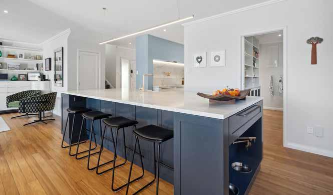 while a built-in library, window seat, and feature lighting create a relaxed ambience. The v-groove panelled ceiling extends over the decking, offering seamless indooroutdoor flow to the lawn and the new pool beyond. “The ceiling detailing was very challenging. It serves as a focal point from every angle in the living pavilions, so the fit, fixing, and finishing had to be precise,” explains Adam.