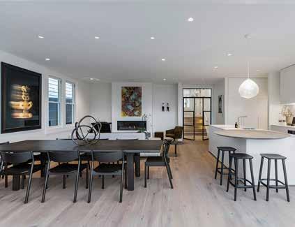 Adding to the property’s visual appeal is its threedegree mono pitch roof, which features internal gutters for a sleek, modern look. “The roofline slopes in three directions, with a continuous fascia line around the roof edge which creates up to 3.6m ceilings in the living areas and preserves the neighbours’ views at the rear. Roof flashings and fascia were crafted with a single folded flashing to ensure a cohesive appearance,” explains Erin.