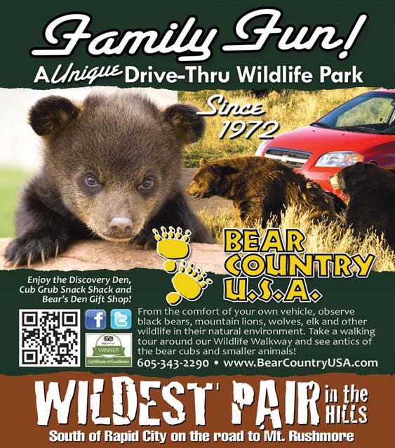 Pony Rides Pig Races Bottle Feeding So Much More! $ 1 OFF ONE ADMISSION 605.737.4815 • oldmacdonaldsfarmrc.com 9 MILES SOUTH OF RAPID CITY ON HWY. 16 Cert1218Fd CHUCKWAGON SUPPER SHOW It’s a hand clappin’ toe tappin’ good time! COME EARLY TO SEE DANCES WITH WOLVES FILM SET! 6:30pm Supper Bell Rings! 7:15-8:15pm Fort Hays Wranglers perform their upbeat Western Music Variety Show. Menu: Chuckwagon Potatoes, BBQ Beef or Chicken, Baked Beans, Biscuits, Applesauce, Old Fashion Spice Cake, Cowboy Coffee and Tenderfoot Lemonade. Make Reservations Early!605-394-9653 5 mi. S of Rapid City on Mt. Rushmore Rd/Hwy 16W HOMEMADE ICE CREAM • Homemade Fudge • Boba Tea • Lattes • Italian Sodas • Smoothies • Sandwiches • Gourmet Freeze Dried Foods and more Located 1 Block from the “Center of the Nation” Monument HWY 85, 603 5th Ave, Belle Fourche, SD 605-723-1607 • HotShotsIceCream.com A great stop on the scenic route to Yellowstone! FIREHOUSE BREWING CO. 610 Main St, Downtown Rapid City, SD SOUTH DAKOTA’S OLDEST BREWERY BREW PUB • FAMILY FRIENDLY OPEN DAILY 4 8 19 6 Bear Country USA 13820 South Highway 16 Rapid City (605) 343-2290 or (541) 646-2059 BearCountryUSA.com Beaver Lake Campground 12005 U.S. Highway 16 Custer (605) 673-2464 BeaverLakeCampground.net Campbell County CVB 314 South Gillette Avenue Gillette (307) 686-0040 VisitGilletteWright.com Cosmos Mystery Area 24040 Cosmos Road Rapid City (605) 343-9802 CosmosMysteryArea.com Crazy Horse Memorial® 12151 Avenue of the Chiefs Custer (605) 673-4681 CrazyHorseMemorial.org Firehouse Brewing Co. 610 Main Street Rapid City (605) 348-1915 FirehouseBrewing.com Flags and Wheels Indoor Racing 405 12th Street Rapid City (605) 341-2186 FlagsAndWheels.com Gold Diggers 2017 Mount Rushmore Road Rapid City (605) 341-9655 505 Main Street Wall (605) 279-2354 241 Main Street Hill City (605) 574-3332 127 Winter Street Keystone (605) 666-5952 BHGoldDiggers.com Gold Pan Saloon 508 Mount Rushmore Road Custer (605) 673-8850 Hills Inn 640 South 6th Street Hot Springs (605) 745-3130 HotSpringsHillsInn.com Hot Shots Ice Cream & Fudge 603 5th Avenue Highway 85 Belle Fourche (605) 723-1607 or (508) 965-5100 HotShotsIceCream.com Mount Rushmore Tours / Fort Hays Chuckwagon 2255 Fort Hayes Drive Rapid City (605) 343-3113 MountRushmoreTours.com Old MacDonald’s Farm 23691 Busted Five Court Rapid City (605) 737-4815 OldMacDonaldsFarmRC.com Rapid Wash Car Wash 1735 Haines Avenue (605) 791-9274 5110 5th Street (605) 791-1464 Rapid City RapidWashCarWash.com Reptile Gardens 8955 South Highway 16 Rapid City (605) 342-5873 ReptileGardens.com Runwild Playground 7089 Infinity Drive Summerset (605) 787-6893 PlayRunwild.com Rush Mountain Adventure Park / Rushmore Cave 13622 Highway 40 Keystone (605) 255-4384 RushMtn.com Rushmore Borglum Story 342 Winter Street Keystone (605) 359-9924 or (605) 359-9222 RushmoreReservations.com Rushmore Tramway Adventures 203 Cemetery Road Keystone (605) 666-4478 RushmoreTramwayadventures.com Sprockets Fun Foundry 221 Swanzey Street Keystone (605) 666-4242 Sprockets.fun VR Den 505 7th Street Rapid City (605) 389-4632 VRDenRC.com 1 2 3 4 5 6 7 8 9 10 11 12 13 14 15 16 17 18 19 20 21 5 11 7 13 12