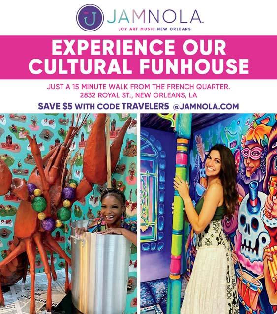 TRAVEL INFO GUIDE Visitortips.com/tig/neworleans LOOK INSIDE FOR THINGS TO DO AND HELPFUL INFO Certified’sTRAVE LER INFO GUIDE NEW ORLEANS Louisiana F R E E MA P EDI T ION 2024 @Visitortips #TravelerInfoGuides FrenchMktNOLA French Market New Orleans LEARN MORE @ FRENCHMARKET.ORG SHOPPING • RESTAURANTS • EVENTS IN THE HEART OF THE FRENCH QUARTER SIX HISTORIC BLOCKS OPEN DAILY! DISCOVER e DISTRICT! FIND THE BEST ATTRACTION DEALS IN NEW ORLEANS! AttractionDeals.com Scan and Save! DEALS 1301 Decatur St. New Orleans Mon-Thur 11am-9pm Fri-Sun 10am-10pm PSYCHIC READINGS • SHOPPING • GOOD VIBES • ALL INCLUSIVE SassyMagick.com Daily 10am-8pm 840 Royal St. New Orleans 504-354-1165 • sassy.magick@gmail.com 25 minutes away from downtown New Orleans and 10 minutes away from the New Orleans International Airport 9 am - 5:30 pm Monday through Sunday Tours available on the hour and every half hour French Quarter Ghost Tour French Ghost Tour 3pm Daily (Only on)(Dec. 26 - Aug 15 & Oct 1 - Nov 30) 6pm + 8pm - Every night 5 in 1 Tour Experience 5 in 1 Experience 5:00pm & 7:30pm Daily/Nightly Monday - Sunday New Orleans Voodoo Tour Voodoo Tour 7:30pm - Fri./Sat./Sun. Haunted Pub Crawl 5:30pm & 8:15pm Nightly Movie Site Tour 4pm&7pmWednesday-Sunday TRUE CRIME TOUR 5:15pm & 7:45pm Nightly All of the above tours meet at 723 St. Peter Street in the French Quarter New Orleans Cemetery Tour New 10:15am & 1:15pm Daily 5101 Canal Blvd. Garden District Tour 10am & 1:00pm Daily 2727 Prytania Street