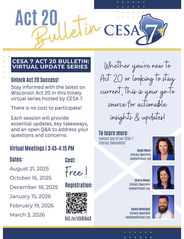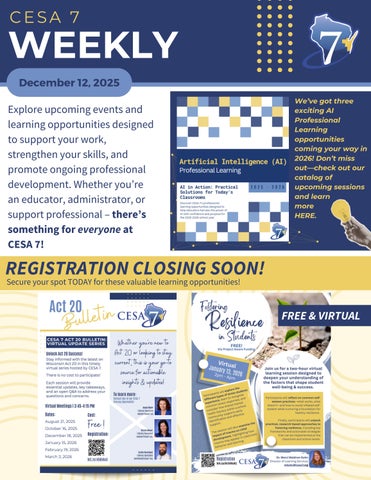 Exploreupcomingeventsand learningopportunitiesdesigned tosupportyourwork, strengthenyourskills,and promoteongoingprofessional development.Whetheryou’re aneducator,administrator,or supportprofessional–there’s somethingfor everyone at CESA7!