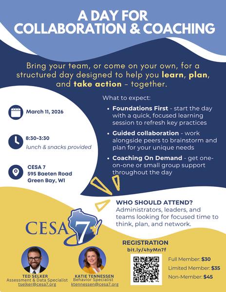 Exploreupcomingeventsand learningopportunitiesdesigned tosupportyourwork, strengthenyourskills,and promoteongoingprofessional development.Whetheryou’re aneducator,administrator,or supportprofessional–there’s somethingfor everyone at CESA7!