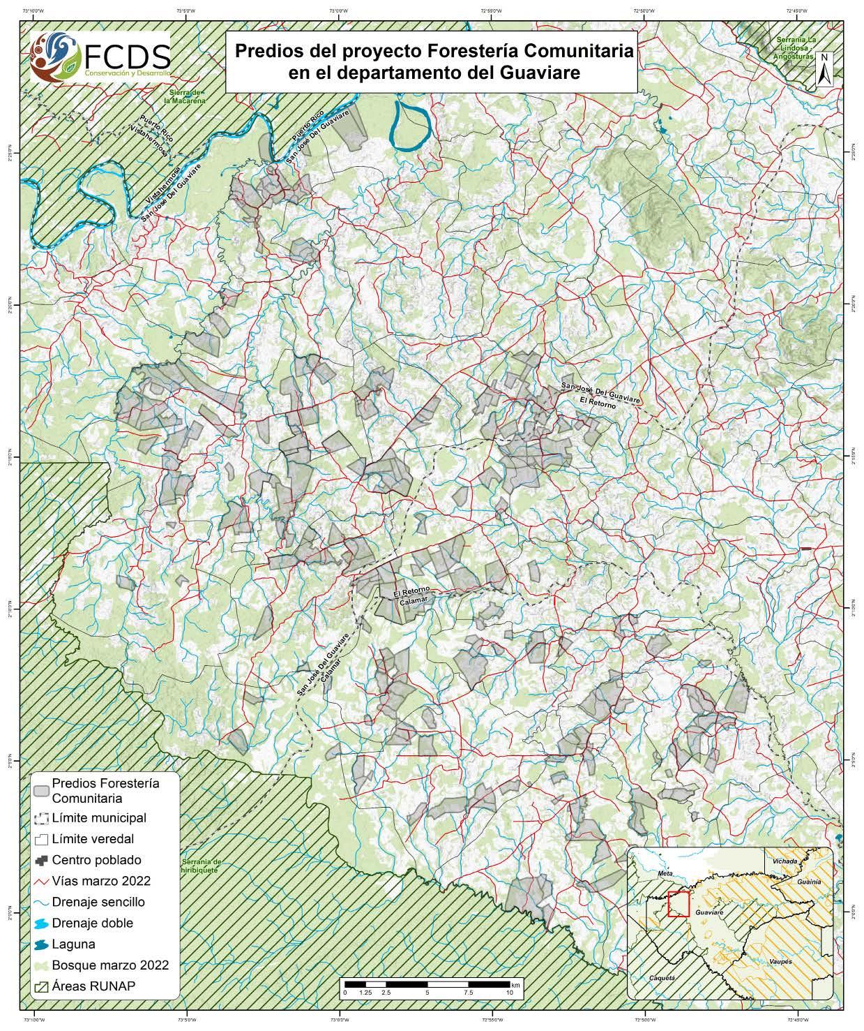 El programa de Forestería Comunitaria se desarrolla en el área de influencia directa del Parque Nacional Natural Serranía de Chiribiquete con financiación de la Embajada de Noruega y la Agencia de los Estados Unidos para el Desarrollo Internacional (USAID). En la actualidad el programa cuenta con más de 300 usuarios que se localizan en 32 veredas, agrupadas en tres sectores: Asocapricho, Cristalina y Guayabero. El programa se desarrolla en el departamento del Guaviare, en conjunto con las Juntas de Acción Comunal de cada vereda. El programa de Forestería Comunitaria cuenta con la