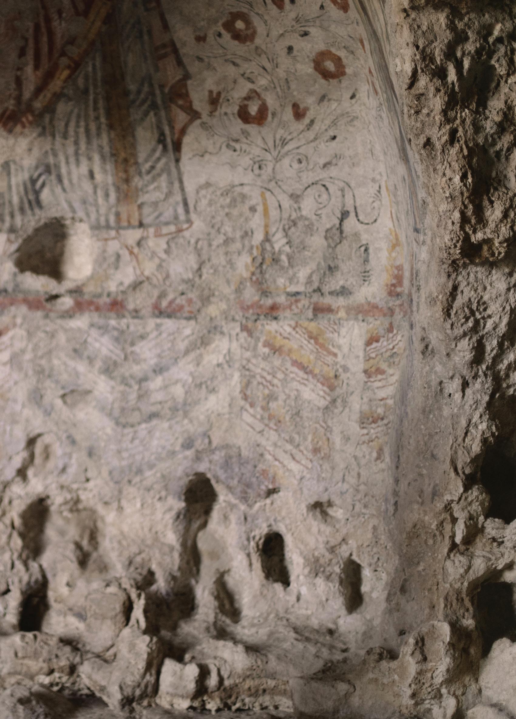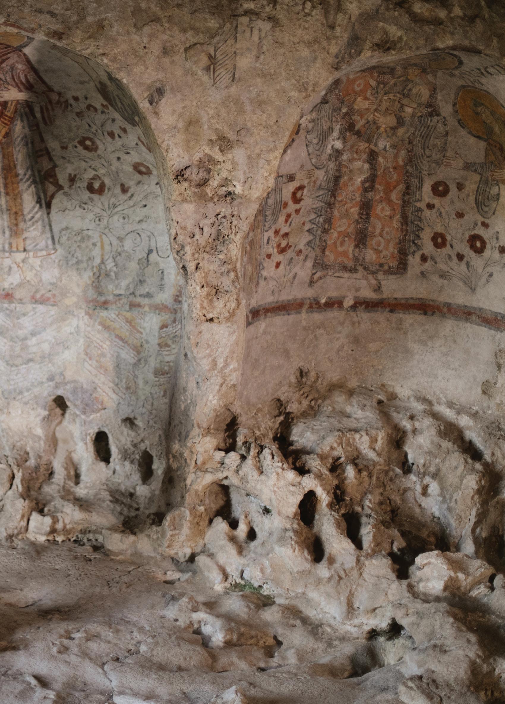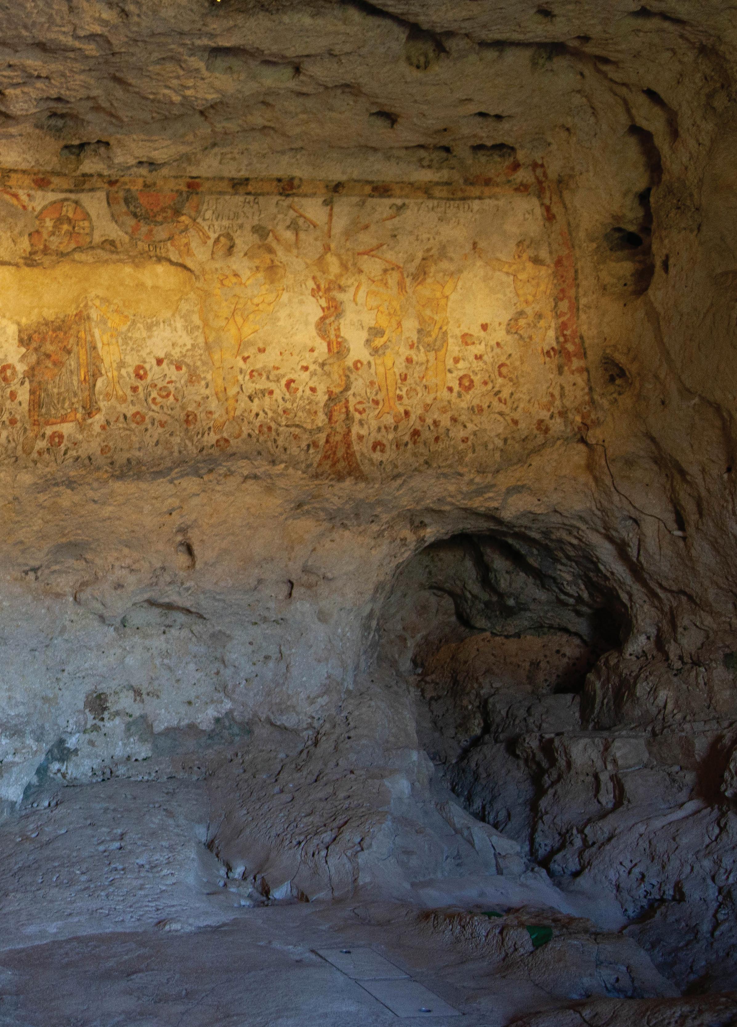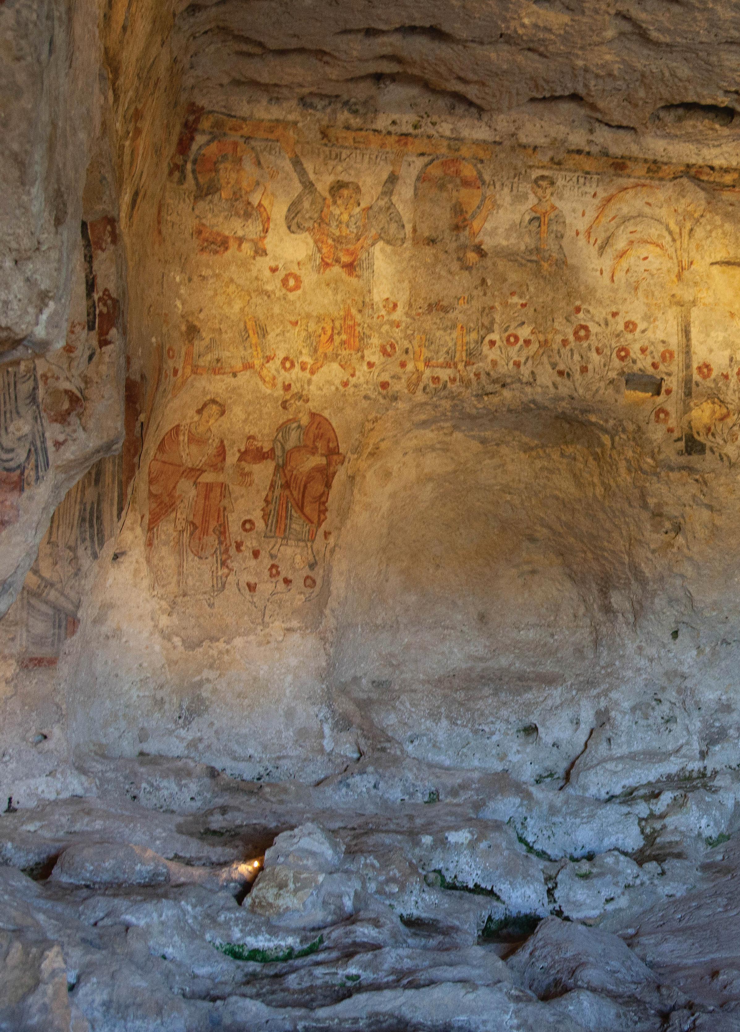 the side wall, in the three apsidal basins, splendid triarchies are depicted: the Apostles (Peter, Andrew and John), the Archangels (Michael, Gabriel and Raphael) and the veneration of the Virgin Queen by two saints. This precious cycle of frescoes, which had been attacked by moss, lichens and cyanobacteria for years, was recovered thanks to a project by the Zétema Foundation, with the consultancy of the Central Institute for Restoration and the participation of committed professionals. The restoration work, made possible thanks to funding from the Foundations CARIPLO in Milan, CARISBO in Bologna and Cassa di Risparmio di Piacenza e VigevanoaspartofACRI'sSviluppoSudproject, constitutes a scientific benchmark, a code of practice for future interventions on the world's rupestrianheritage.