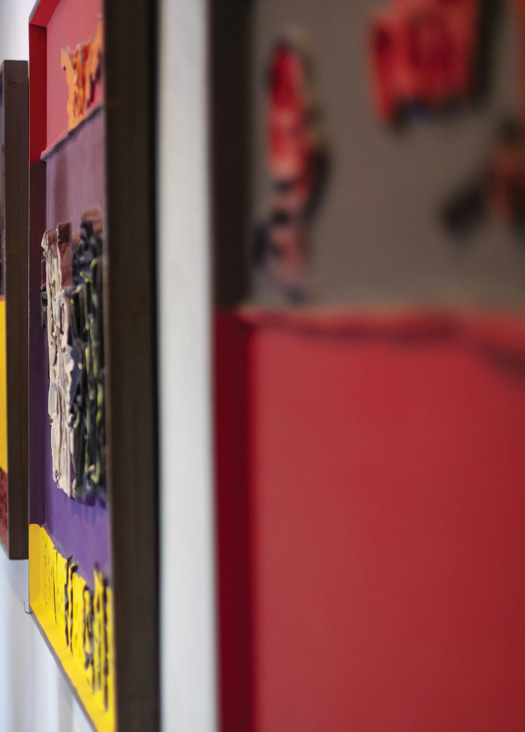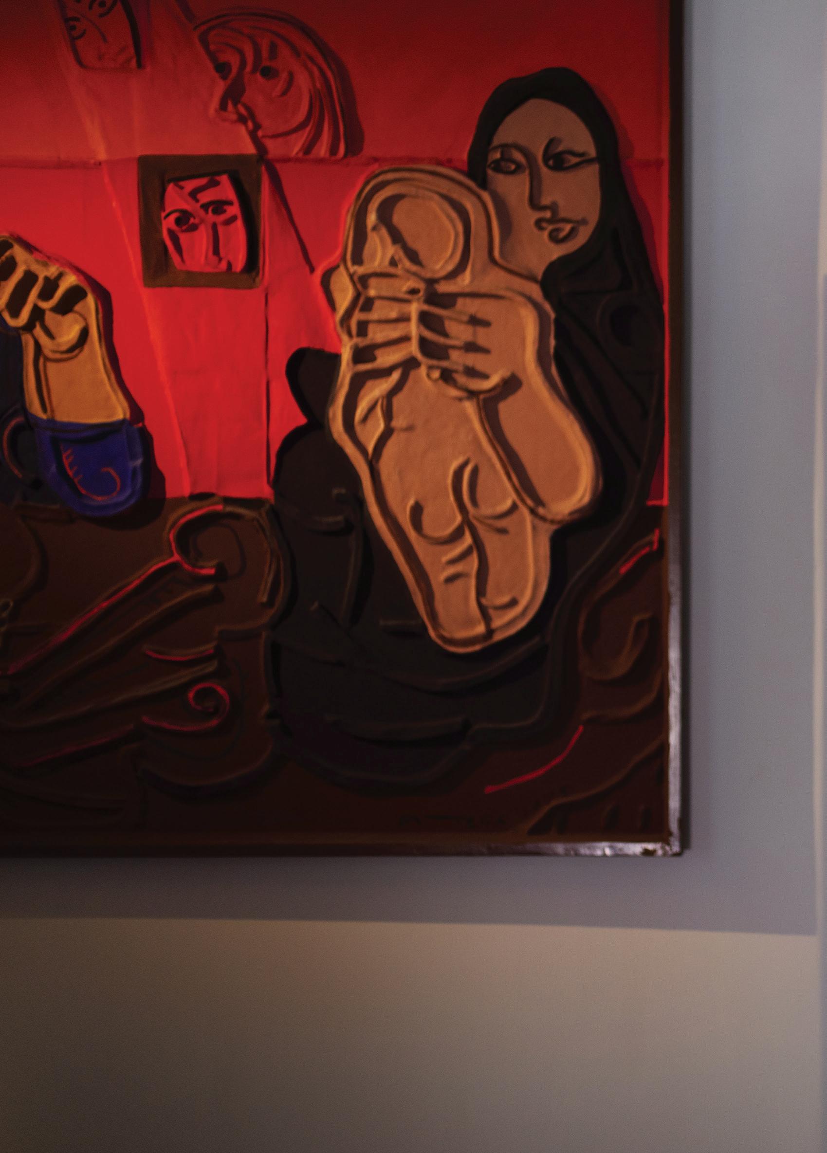 TheroomsaredecoratedbyGiuseppeMitarotonda's ceramics and handicrafts that express the mutual enrichment between art and ancient crafts. To create the cycles 'Passed' and 'Death and Birth of the Innocent', Ortega experimented with papiermâché to give three-dimensionality to his painting. Together with master papier-mâché makers from Matera, the artist created terracotta bas-reliefs from which he made plaster casts in which the paper mixture was moulded. The works thus modelled were thenfixedonawoodenscaffoldandfinallypainted.